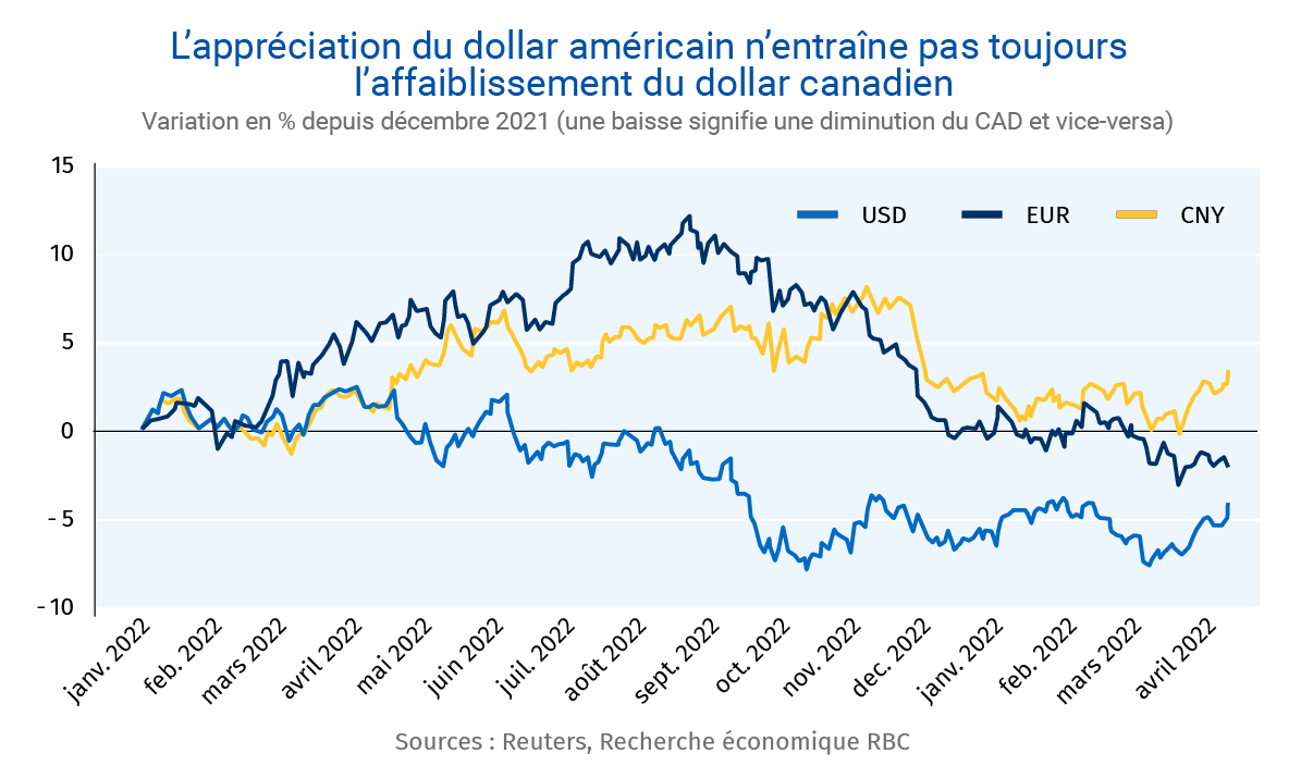 En outre, le dollar canadien s’est apprécié par rapport au yuan et au yen depuis la fin de 2021. Les importations bon marché d’autres grands partenaires commerciaux tels que la Chine ont d’ailleurs dû compenser, au moins partiellement, la pression exercée par l’appréciation du dollar américain.