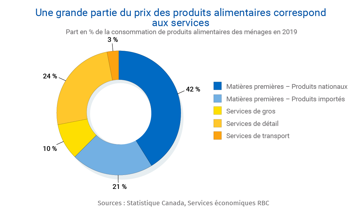 - Même en ce qui concerne les produits alimentaires sensibles au taux de change, le tiers des plus de 100 milliards de dollars dépensés annuellement en produits alimentaires au Canada sont liés à des services nationaux, tels que le transport et le commerce de détail.