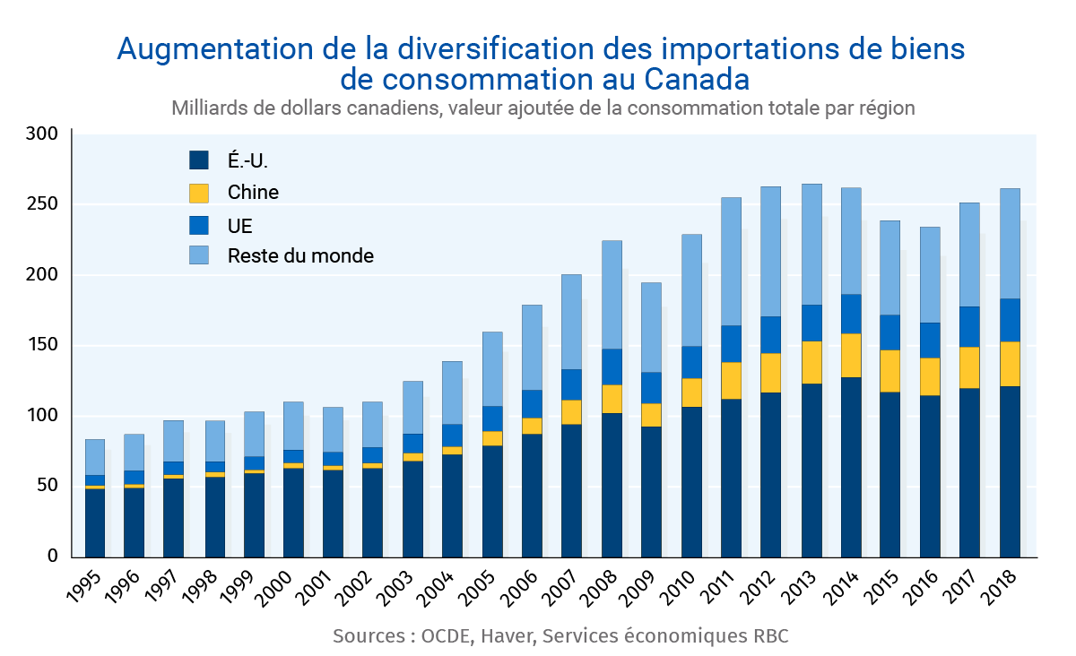 Il va sans dire que les taux de change continuent d’influer sur le prix des biens et des services importés au Canada. Cependant, puisque la part des importations de pays autres que les États-Unis s’est accrue, le poids du billet vert a reculé. Il est également à noter que la valeur des importations directes des États-Unis comprend une part importante d’intrants intermédiaires d’autres pays. Selon l’OCDE, 46 % des importations de biens de consommation au Canada provenaient des États-Unis en 2018, contre 56 % en 1995. Les exportations chinoises au Canada semblent expliquer en grande partie cette baisse (12 % en 2018, contre seulement 2 % en 1995).