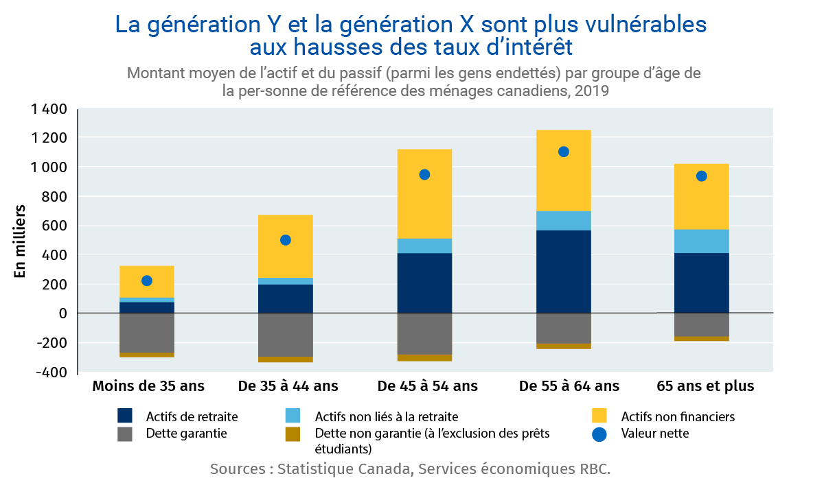 Les baby-boomers, qui forment la plus grande cohorte du Canada, s’en tirent mieux. Les personnes âgées de 65 ans et plus représentent près d’un quart des déclarants et 20 % du revenu total des ménages. En règle générale, ce groupe est beaucoup moins sensible aux hausses des taux d’intérêt. En effet, seuls 14 % des ménages de baby-boomers ont encore une dette hypothécaire et, pour ceux qui en ont une, le solde moyen correspond à la moitié de celui de la génération Y. Les baby-boomers et les membres plus âgés de la génération X (55 ans et plus) ont aussi accumulé davantage d’actifs productifs d’intérêts. Ils devraient donc profiter d’un contexte de hausse des taux d’intérêt. Les dépôts à terme de particuliers canadiens dans les banques à charte ont augmenté de 200 G$ par rapport aux niveaux d’avant la pandémie, et ce, principalement en raison de l’attrait des taux d’intérêt plus élevés. En ce qui concerne les Canadiens de 65 ans et plus, le revenu d’emploi est également moins important (il représente une petite part de leur revenu total), car leurs actifs les protègent des fortes baisses de revenu associées aux pertes d’emploi. Les deux tiers du revenu de ces personnes sont issus de régimes de retraite privés et de paiements de transfert gouvernementaux. Seulement 16 % de leur revenu proviennent d’un emploi.