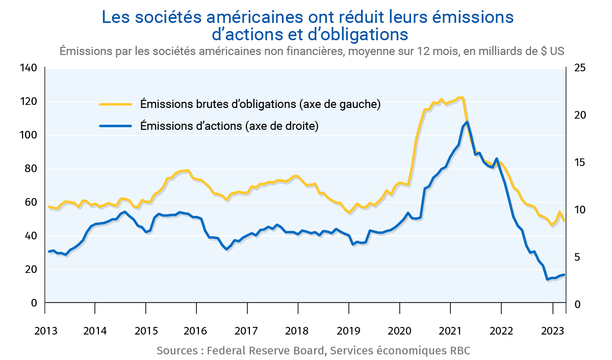 Par rapport aux sociétés des autres pays développés, les entreprises américaines ont davantage recours au financement par emprunt et par émission d’actions qu’aux prêts bancaires. Toutefois, les entreprises n’ont pas considéré le financement par le marché comme une option particulièrement attrayante au cours de l’année écoulée. Les émissions brutes d’obligations par les sociétés non financières sont tombées à leur plus bas niveau depuis 11 ans en 2022, et les émissions d’actions à leur plus bas niveau depuis 22 ans.
