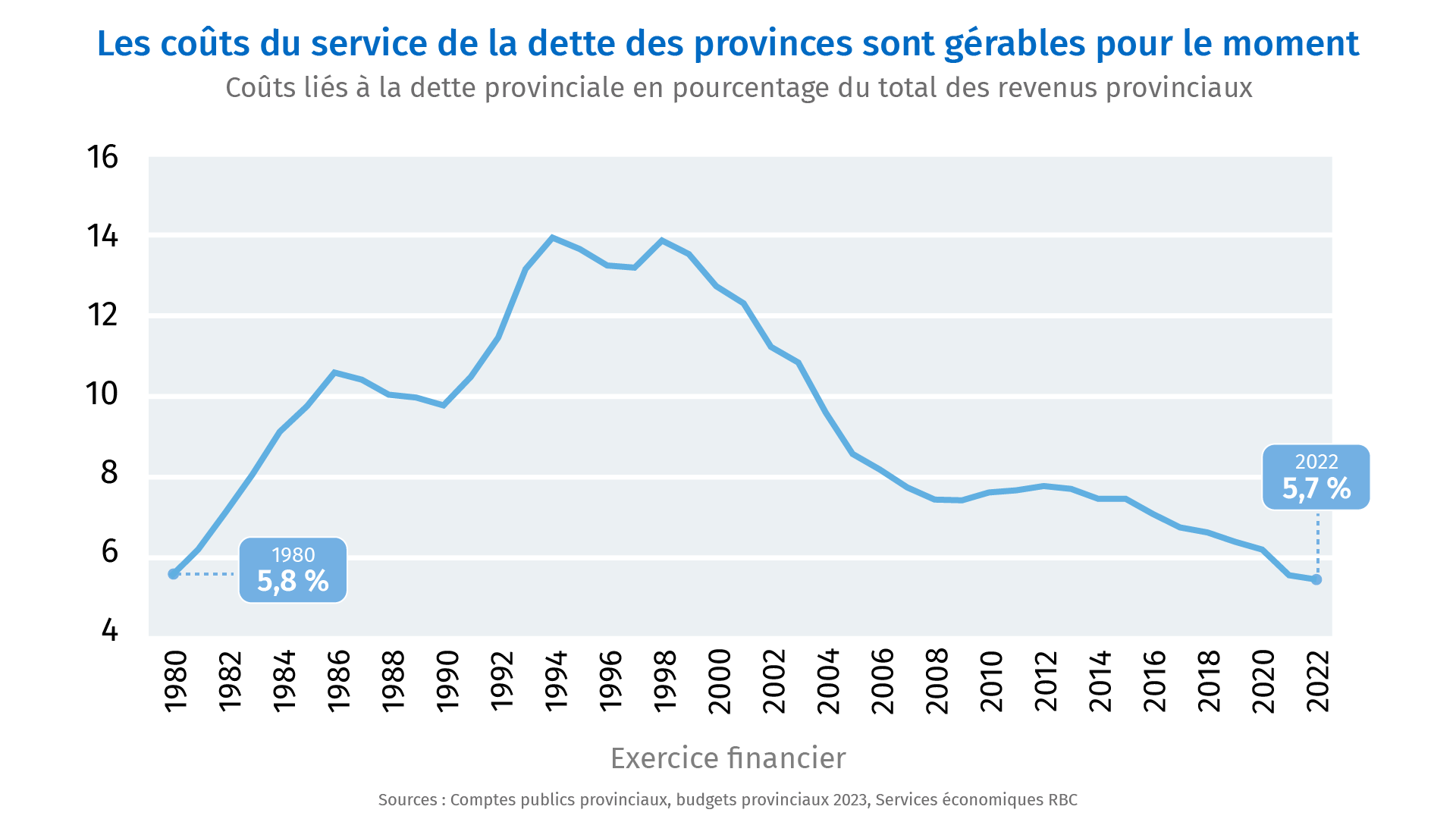 Pour l’instant, les coûts du service de la dette sont supportables. Les gouvernements provinciaux dépensent en moyenne 5,70 $ par tranche de 100 $ qu’ils tirent de leurs revenus pour rembourser leur dette. Cette part devrait augmenter au cours des prochaines années, dans un contexte de taux d’intérêt plus élevés, au risque d’empiéter sur les dépenses dans d’autres domaines comme les soins de santé.