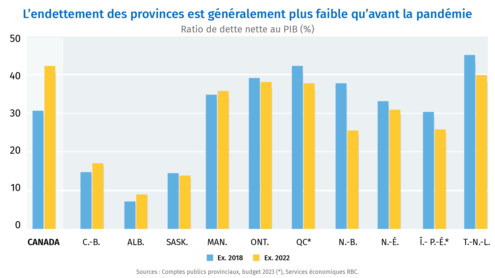 • Le ratio de la dette nette au PIB est inférieur à son niveau d’avant la pandémie dans la plupart des provinces.
