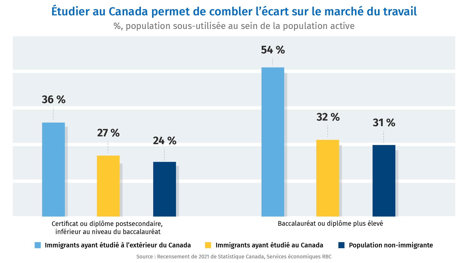 S’ils ont étudié au Canada, les immigrants sont beaucoup plus susceptibles de trouver un emploi qui correspond à leur niveau de scolarité. Les nouveaux arrivants titulaires d’un baccalauréat canadien ou d’un diplôme de niveau plus élevé sont exposés à un risque d’être sous-employés ou de détenir une occupation qui exige moins d’études que le niveau qu’ils ont véritablement atteint de 32 %. Ce chiffre se compare à un pourcentage de 54 % qui représente le risque de sous-emploi des immigrants formés ailleurs et est pratiquement identique au taux de sous-utilisation de 31 % qui vise les travailleurs non immigrants.