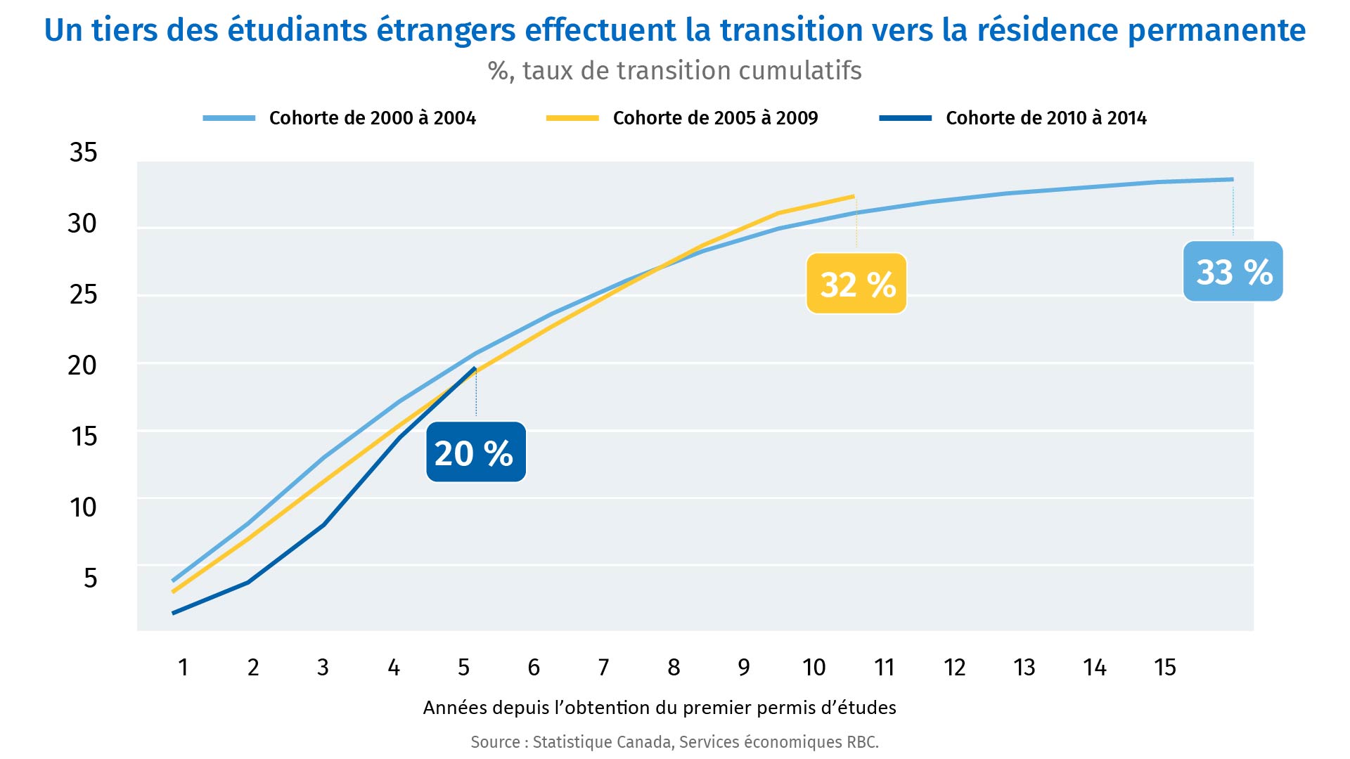 Cependant, une éducation canadienne aide les nouveaux arrivants à acquérir certains des éléments indispensables à leur intégration sur le marché du travail. Et, pour le Canada, il s’agit là d’une voie particulièrement efficace sur le plan de l’immigration. Le résultat, qui prend la forme d’une bien meilleure utilisation des compétences des immigrants, ouvre la voie non seulement à un meilleur potentiel de gains pour les nouveaux arrivants, mais également à de meilleures perspectives pour la productivité globale de la main-d’œuvre. Dans un contexte de déclin de la croissance démographique naturelle, cet aspect est essentiel pour intervenir à l’égard des problèmes structurels sur le plan de la main-d’œuvre, dont nous nous attendons à ce qu’ils persisteront une fois la récession terminée.