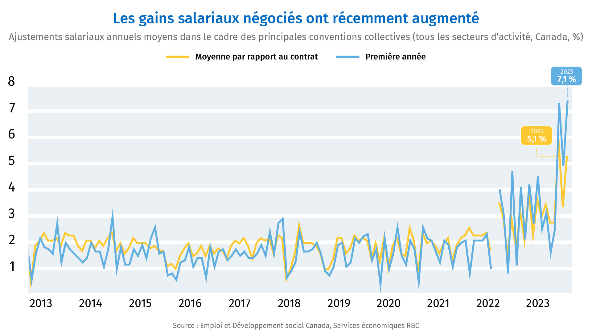 Bien que les taux d’inflation exceptionnellement élevés aient sans aucun doute alimenté la détermination des travailleurs, d’autres forces contribuent probablement aux gains obtenus dans les récentes négociations salariales. En effet, le vieillissement de la population canadienne a accéléré la sévère pénurie de main-d’œuvre, ce qui a donné un plus grand pouvoir de négociation aux employés. En même temps, le taux de syndicalisation a augmenté au pays, ce qui a permis à une plus grande proportion de la main-d’œuvre canadienne de profiter de la protection de conventions collectives. Cela découle probablement plutôt de la proportion croissante d’employés travaillant dans des secteurs ou occupant des emplois où les syndicats sont plus présents (c.-à-d. l’éducation, les soins de santé et l’administration publique) que de la résurgence des syndicats. Néanmoins, le bond relatif aux récents accords salariaux pourrait inciter d’autres syndicats à formuler des demandes plus agressives, surtout compte tenu du fait que les travailleurs doivent absorber de nombreuses augmentations de salaire avant de rattraper l’inflation.