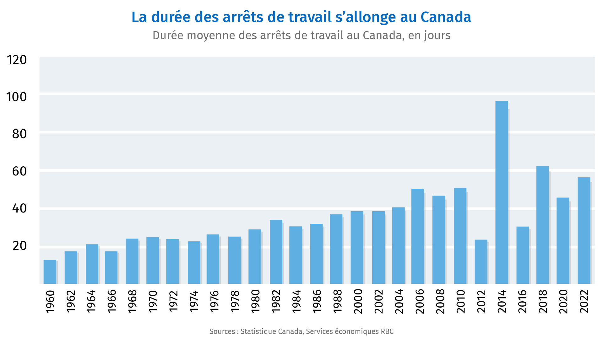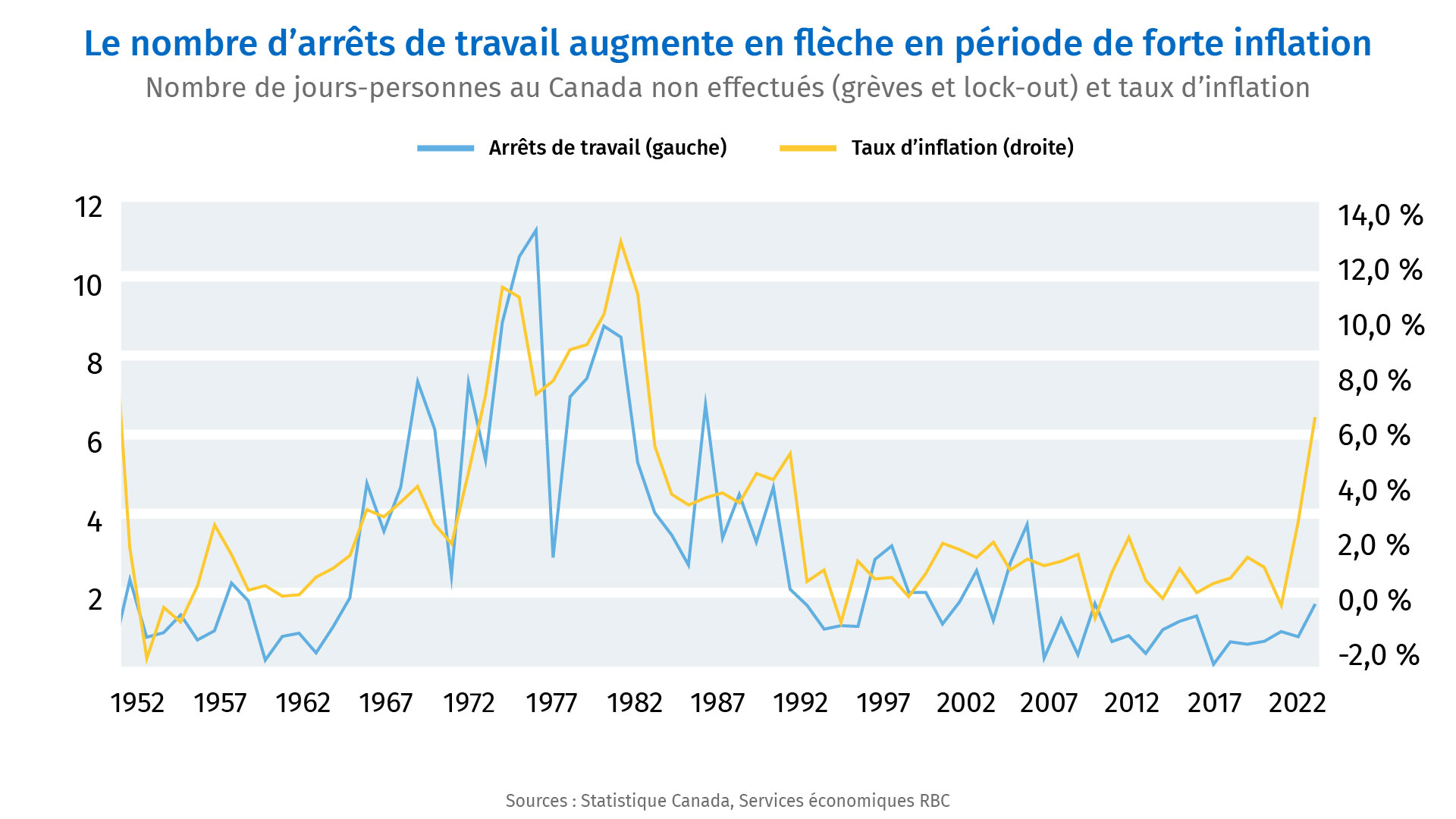 La croissance des tensions entre les employeurs et le personnel n’est pas nécessairement surprenante. Historiquement, les arrêts de travail font perdre plus de temps lorsque l’inflation est élevée, car l’affaiblissement du pouvoir d’achat incite les travailleurs à se mobiliser dans le cadre des négociations sur les contrats de travail.
