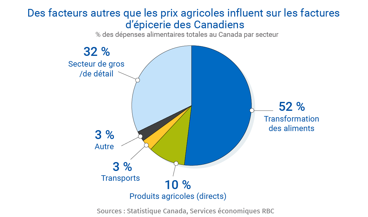 Bien d’autres coûts stimulent aussi les prix des denrées alimentaires. En effet, le coût des produits alimentaires bruts ne représente que 10 % du prix que paient les consommateurs en fin de compte. Le reste provient des coûts de traitement, d’emballage et de transport local, qui ont tous également été stimulés par les perturbations de la chaîne logistique. Ces coûts sont relativement stables en temps normal et ont un effet atténuant sur les prix des produits alimentaires bruts connus pour leur volatilité, mais ont simultanément progressé l’an dernier. Les délais d’expédition par voie maritime ont été plus longs en 2022 et le coût du transport ferroviaire et routier a fortement grimpé au Canada. Les pénuries de main-d’œuvre ont également stimulé les salaires dans tous les secteurs. Les consommateurs avaient, quant à eux, acquis un plus grand pouvoir d’achat grâce à l’épargne accumulée pendant la pandémie, ce qui a permis aux entreprises de leur transférer une plus grande part de ces coûts.