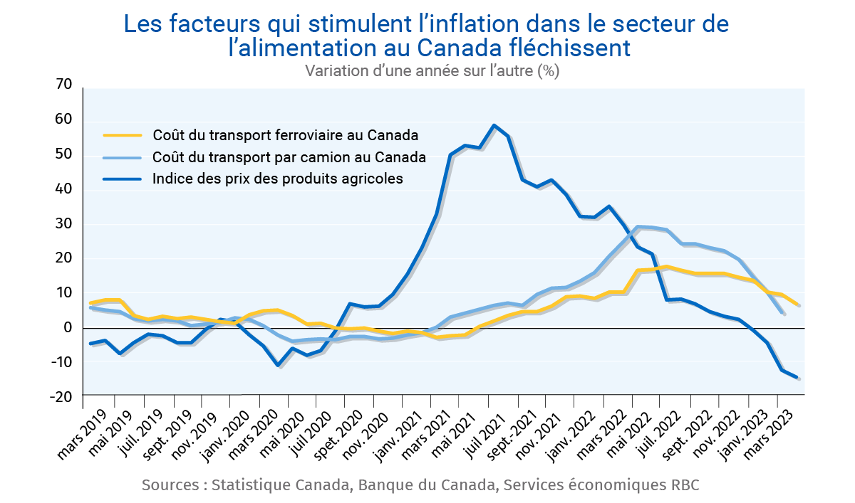 L’indice des prix des produits agricoles, qui mesure la variation des prix que reçoivent les agriculteurs pour les produits agricoles qu’ils produisent et qu’ils vendent au Canada, a même baissé de 3 % sous les niveaux d’il y a un an en mars après avoir atteint un sommet l’été dernier. Les coûts du transport ferroviaire et routier qui demeurent relativement élevés au Canada semblent aussi avoir changé de trajectoire au début de l’année. La dernière Enquête sur les perspectives des entreprises de la Banque du Canada a révélé des éléments encore plus positifs touchant l’établissement des prix des entreprises. Plusieurs de ces entreprises anticipent une croissance moindre et s’attendent à ajuster moins fréquemment les prix des extrants au cours de la prochaine année.