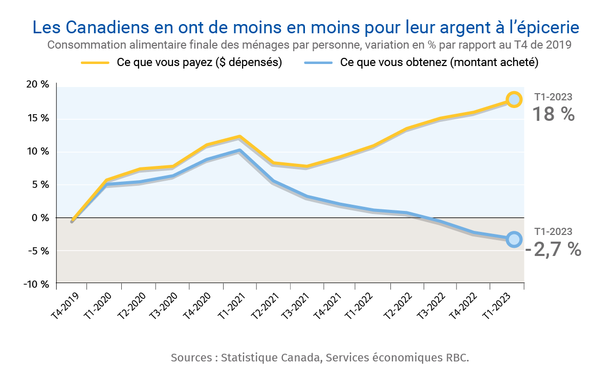 - Les prix des aliments ont bondi de 18 % au cours des deux dernières années, faisant flamber les coûts d’épicerie des Canadiens qui doivent déjà resserrer leurs budgets dans un contexte de hausse de taux.