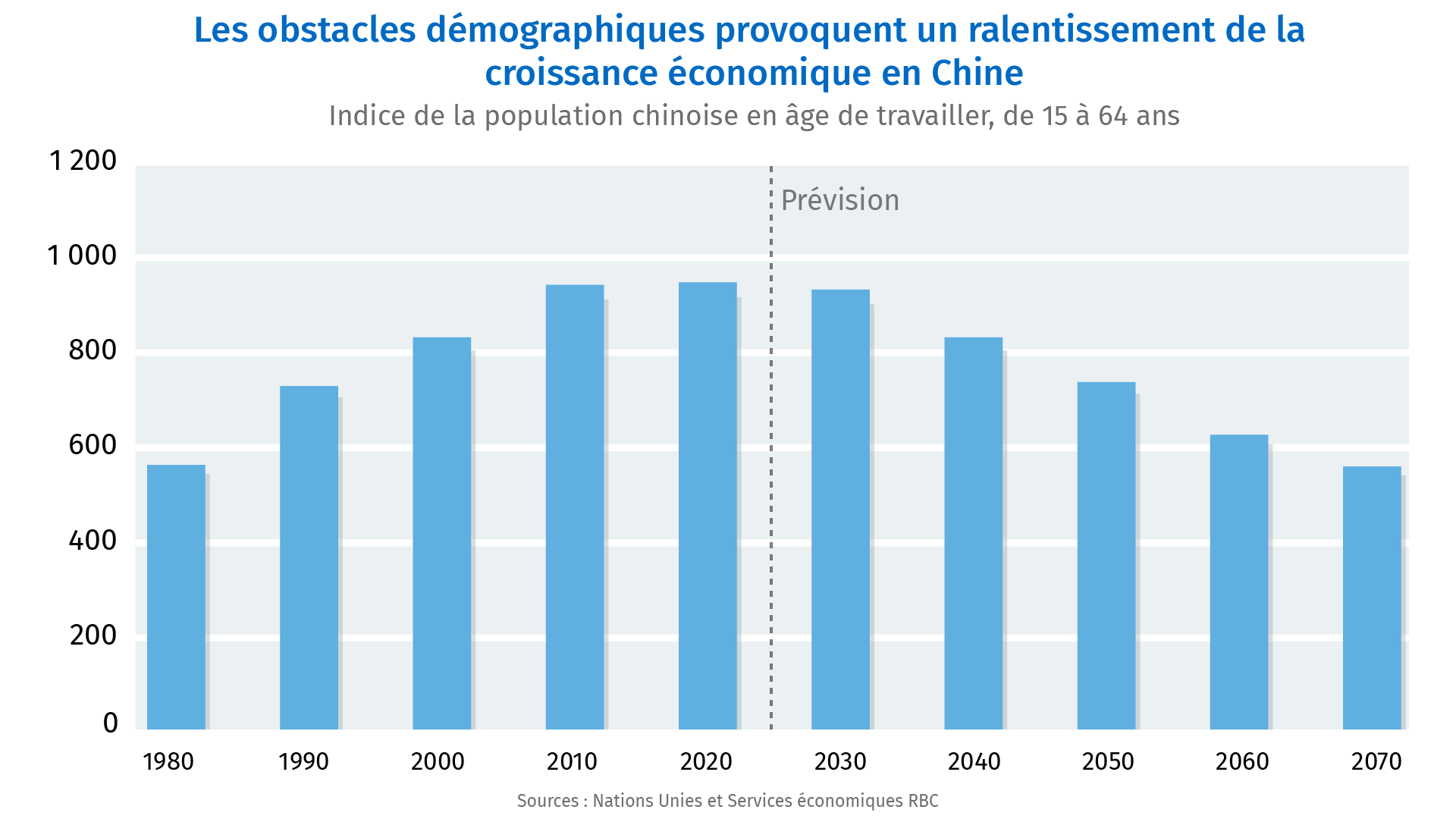 En effet, un ralentissement de la croissance économique en Chine est attendu depuis longtemps. La politique de l’enfant unique mise en œuvre en 1980 a considérablement entravé la croissance démographique. Les parents de la génération de l’enfant unique atteignent maintenant l’âge de la retraite et délaissent rapidement le marché du travail. En fait, la population chinoise en âge de travailler (âgée entre 15 à 64 ans) diminue depuis 2016 et devrait reculer à un peu plus des trois quarts de son sommet d’ici 2030, selon les projections de l’ONU. Une population active en constante diminution signifie que le taux tendanciel de croissance économique en Chine continuera de fléchir, et que la période d’expansion ultrarapide (au rythme annuel de 7 % ou 8 %) de l’économie chinoise est chose du passé.