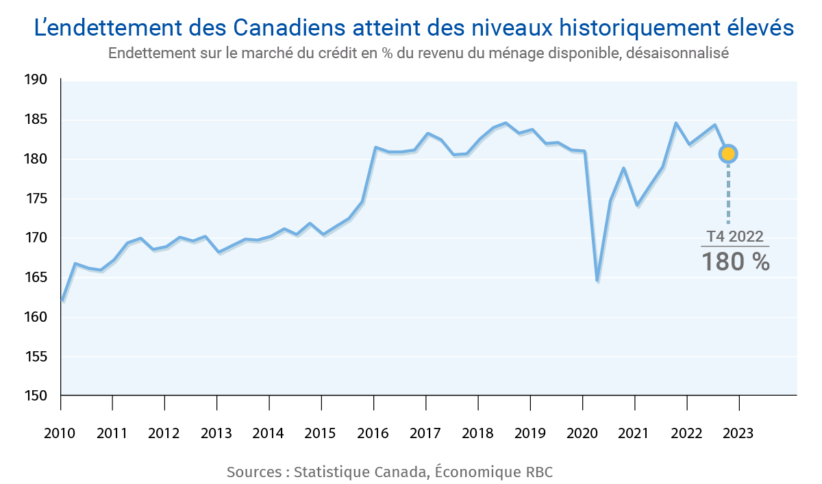 De nombreux ménages ont, au contraire, vu leur situation financière s’améliorer pendant la crise : leur valeur nette a augmenté et les divers paramètres du service de la dette, les prêts en souffrance et l’insolvabilité des consommateurs se sont nettement redressés. Ce redressement de situation peut être attribué aux importants programmes d’aide (comme la PCU et la PCRE) qui avaient été mis en place, et à la politique monétaire fortement accommodante qui fut une véritable bouée de sauvetage pour de nombreux Canadiens, dont la plupart ont pourtant continué de s’endetter. En effet, l’essor du marché du logement en a incité un bon nombre d’entre eux à contracter des dettes hypothécaires. Et l’on s’est retrouvé à la fin de 2021 avec un ratio d’endettement des ménages canadiens qui dépassait les niveaux d’avant la pandémie. Ce ratio est resté élevé depuis.