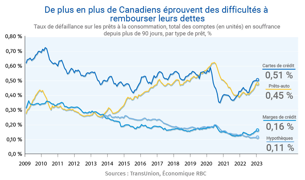 Le nombre des prêts hypothécaires en souffrance n’a pas vraiment augmenté jusqu’à présent (et reste le plus bas jamais enregistré), mais le taux de consommateurs dont le remboursement de la dette est en retard de plus de 90 jours a grimpé, surtout pour ce qui est des emprunts remboursables par versements (habituellement utilisés à des fins ponctuelles comme les rénovations résidentielles, les urgences imprévues et les consolidations de dette), des cartes de crédit, des prêts-automobile et, plus récemment, des marges de crédit.