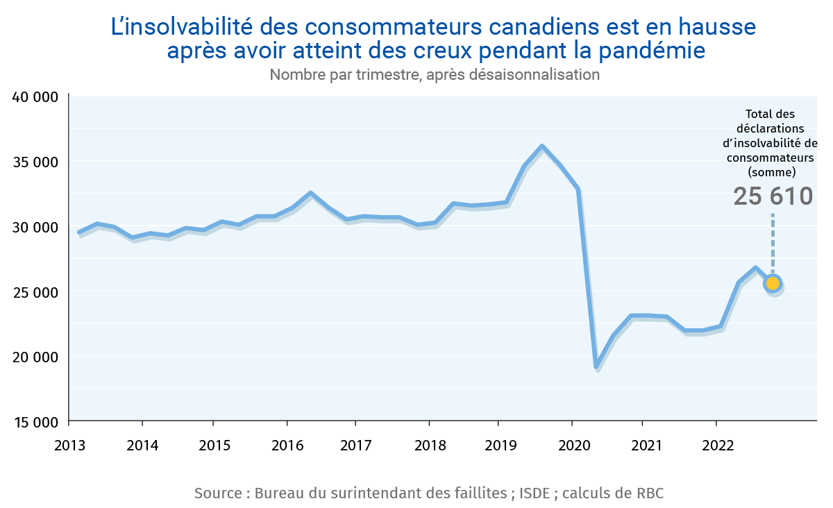 Le risque de récession imminente et les répercussions en cours de la hausse des taux d’intérêt ne feront qu’accentuer les tensions au cours de la période à venir. Bien des créanciers dont les taux s’ajustent automatiquement à l’évolution du taux directeur de la Banque du Canada (comme les prêts hypothécaires à taux variable) doivent déjà composer avec des versements mensuels plus élevés. C’est une réalité qui rattrapera également les titulaires des prêts hypothécaires à taux fixe lors du renouvellement de leurs hypothèques.
