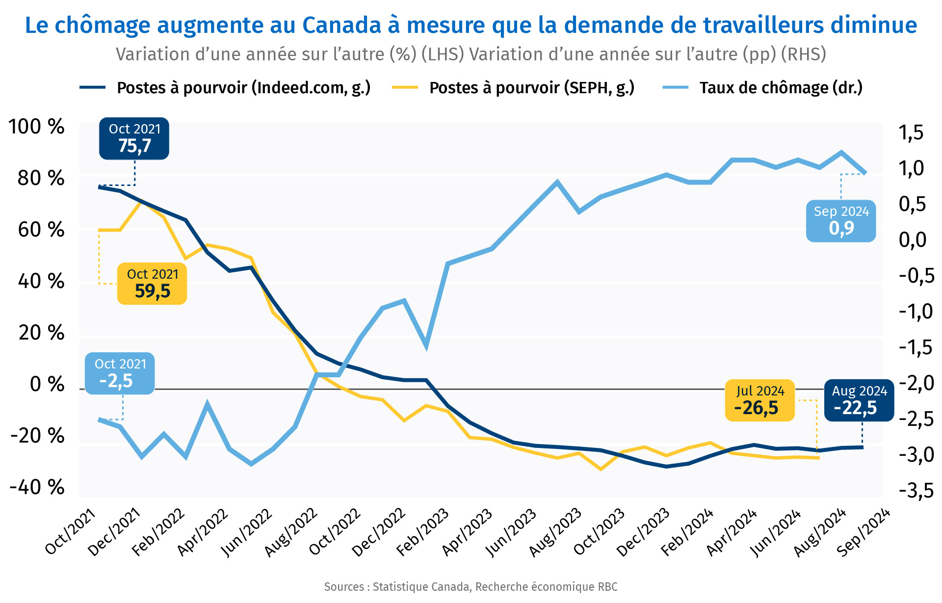 Même si ces renouvellements hypothécaires freineront certainement l’économie dans son ensemble, nous avons souligné il y a déjà presque un an que la vague de renouvellements hypothécaires de 2025 serait surmontable tant que (1) la Banque du Canada abaissait les taux et (2) que le marché de l’emploi ne se détériorait pas trop. La première condition est manifestement remplie, mais nous sommes plus préoccupés par la seconde, car une série de données relatives au marché de l’emploi montrent un affaiblissement.
