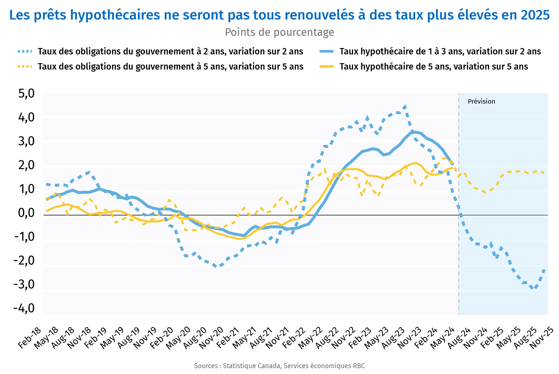 Les baisses de taux de la BdC, qui totalisent 75 points de base jusqu’à présent (beaucoup d’autres sont à venir), ont déjà permis aux détenteurs d’hypothèques de bénéficier d’un certain allègement. Les taux des obligations du gouvernement à cinq ans, sur lesquels sont fondés les taux hypothécaires fixes à cinq ans, ont diminué en conséquence. Aussi, les taux des obligations du gouvernement canadien à deux ans, principal facteur de variation des coûts d’emprunt pour les hypothèques d’un an à trois ans, sont inférieurs aux niveaux d’il y a deux ans. Une grande partie des prêts hypothécaires d’une durée de un à trois ans seront probablement renouvelés à des taux d’intérêt plus bas. Les détenteurs de prêts hypothécaires à taux variable ressentent déjà un certain soulagement, soit en raison de la diminution des versements (pour les prêts hypothécaires à taux variable et à versements variables), soit en raison de la réduction des coûts d’intérêt et de l’augmentation des versements sur capital (pour les prêts hypothécaires à taux variable et à versements fixes).