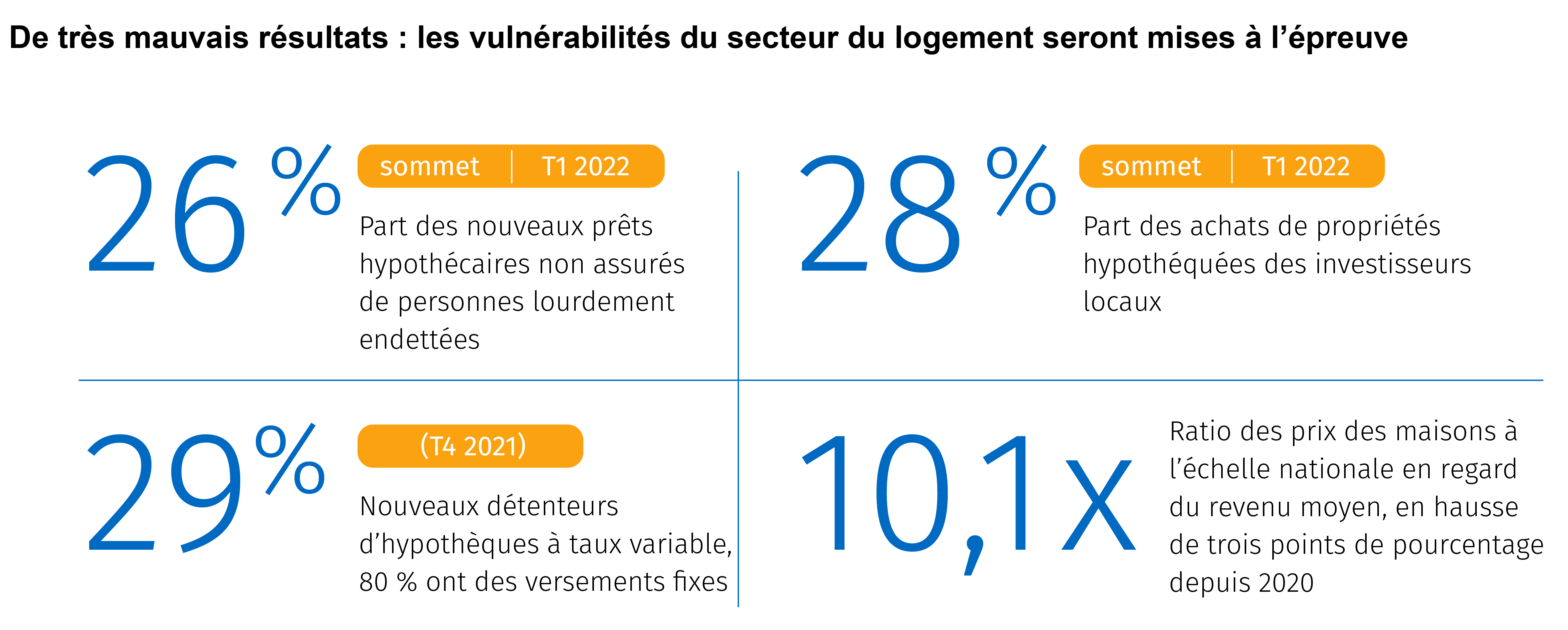 La hausse des taux d’intérêt, le ralentissement des ventes de maisons et la baisse de la croissance mettront le secteur du logement à l’épreuve. La frénésie du marché du logement pendant la pandémie a amplifié les faiblesses économiques. La proportion des nouveaux détenteurs d’hypothèque très endettés, des titulaires de prêts hypothécaires à taux variable et des investisseurs nationaux a augmenté. Les prix des maisons par rapport aux revenus moyens ont aussi augmenté.