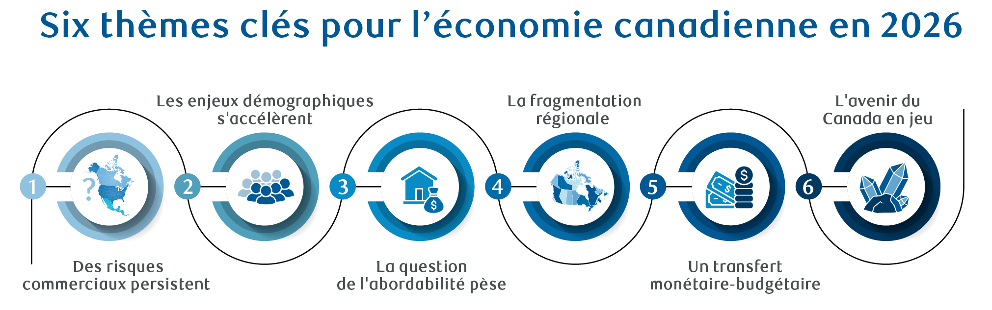 Comme le Canada ne peut être résumé par un chiffre de PIB, au cours de la prochaine année, Services économiques RBC se concentrera sur six grands thèmes qui vont plus loin que les prévisions économiques traditionnelles. Nous nous attaquerons aux risques commerciaux, aux défis démographiques, à la fragmentation régionale, à l’évaluation de l’abordabilité, au transfert monétaire-budgétaire et à l’avenir en jeu.