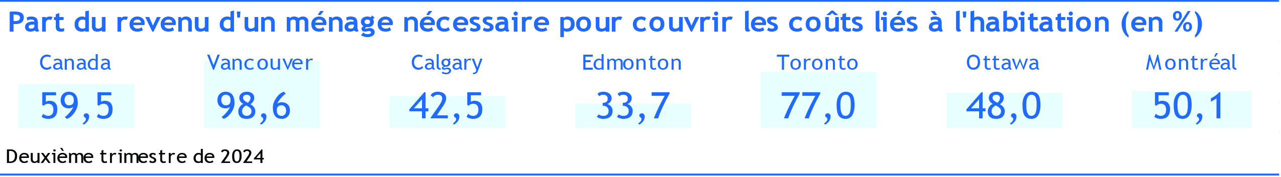 • Les baisses de taux d’intérêt ont fait diminuer les coûts de propriété au deuxième trimestre. La part des versements hypothécaires, des taxes foncières et des services publics dans les dépenses du ménage médian au Canada a diminué. Elle s’établit maintenant à 59,5 % par rapport à 63,7 % au quatrième trimestre de 2023 et à 61,0 % au premier trimestre.