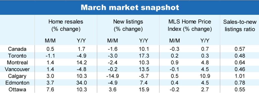 Les conditions de l’offre et de la demande sont demeurées généralement équilibrées au Canada, sauf dans quelques marchés (p. ex., Calgary) où les vendeurs étaient en position de force. Certains vendeurs potentiels se sont peut-être abstenus d’inscrire leur propriété en mars, espérant une demande plus forte cet été. On s’attend de plus en plus à ce que la Banque du Canada abaisse les taux d’intérêt au milieu de l’année.