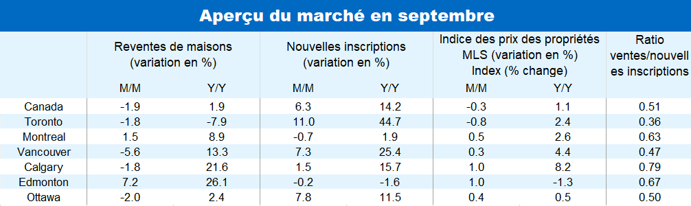 Les rares marchés où les reventes se sont redressées en septembre comprennent Edmonton (+7,2 % m/m), Halifax (+5,9 %), Montréal (+1,5 %) et Québec (+1,1 %).
