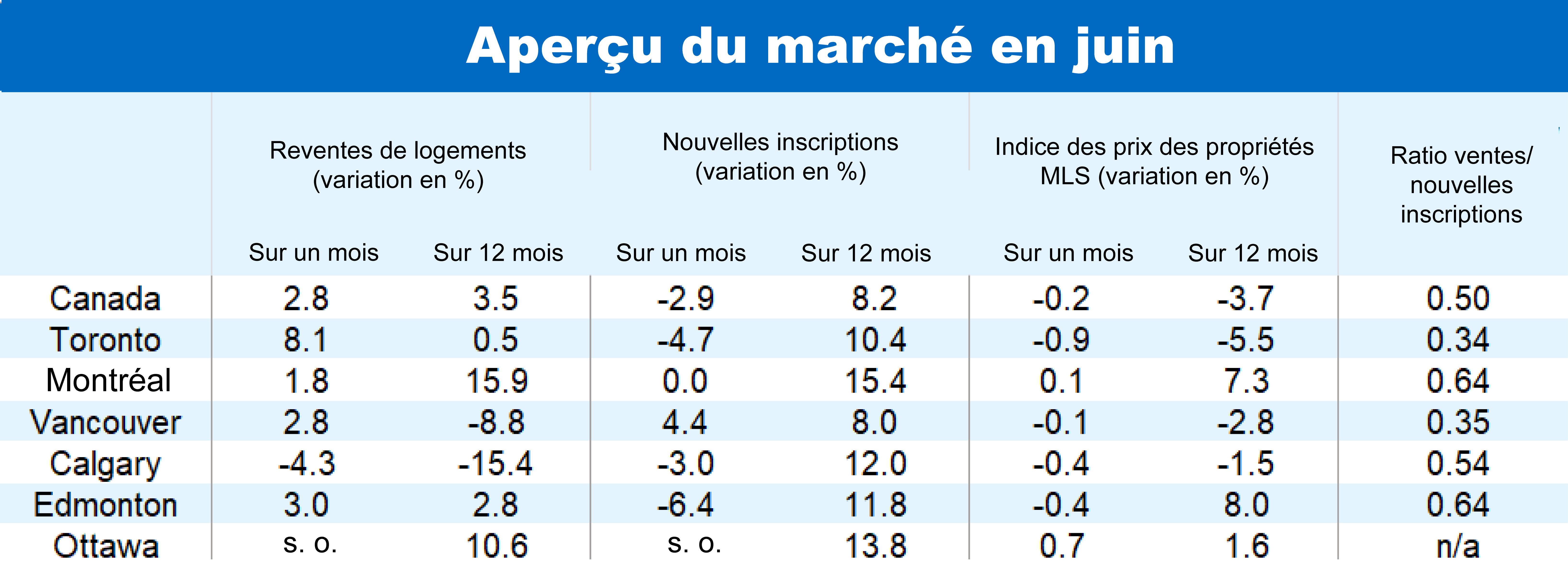 À l’échelle nationale, les reventes de logements ont progressé de 2,8 % en juin par rapport à mai, et de 3,5 % sur 12 mois.