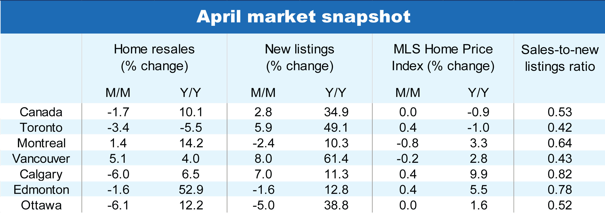 Contrairement aux mois précédents, l’activité a reculé dans la plupart des régions, la Saskatchewan, le Nouveau-Brunswick et Terre-Neuve étant les seules provinces à avoir enregistré une augmentation d’un mois sur l’autre en avril. Les marchés les plus chers du Canada sont quant à eux restés déprimés.
