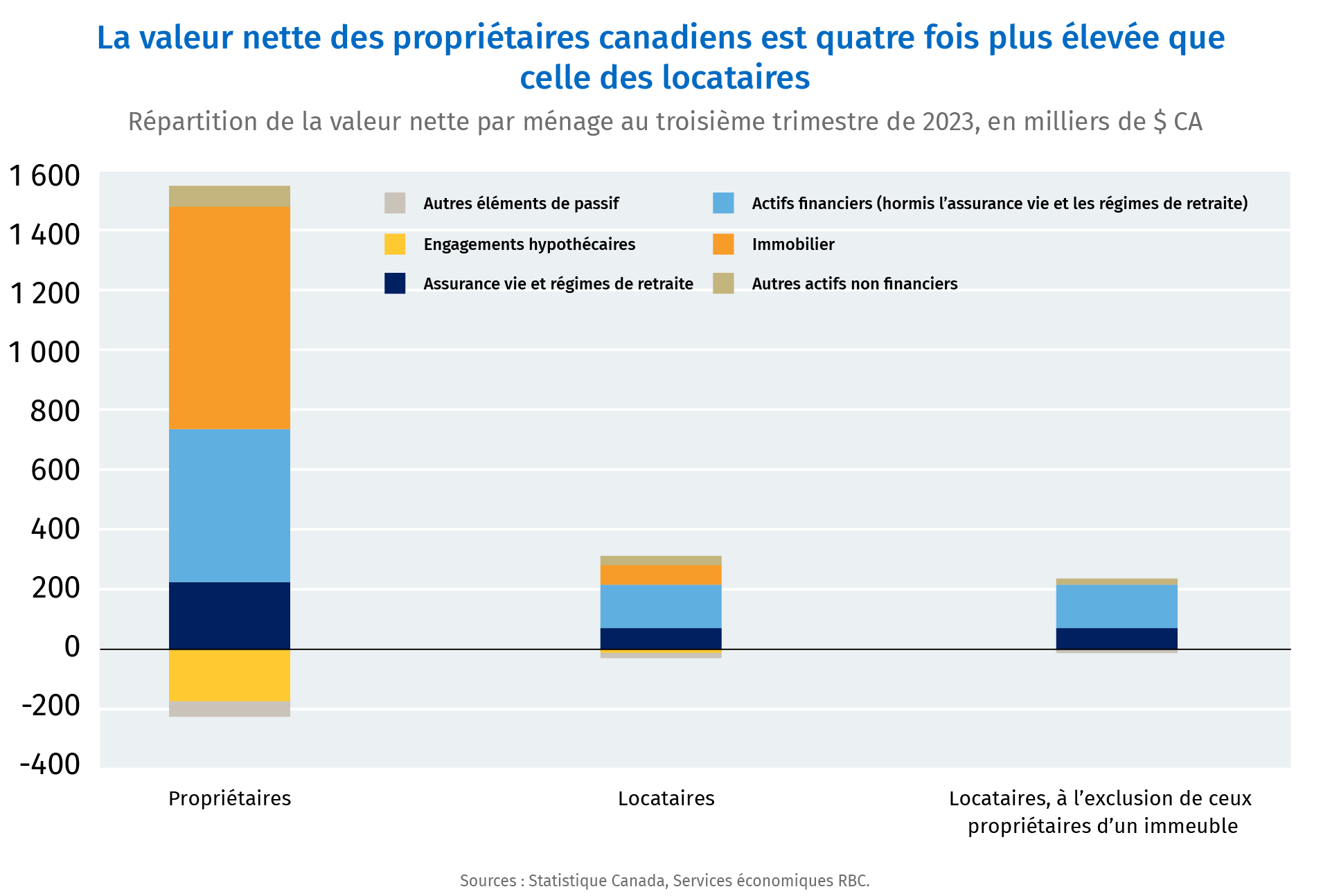 De tout temps, les locataires ont été à l’échelon le plus bas de l’échelle salariale. Ainsi, de nombreuses personnes qui rêvaient de posséder leur chez-eux ont peiné à amasser leur mise de fonds. Au début de 2020, le concours de circonstances – l’octroi de subventions gouvernementales aux ménages et les occasions limitées de dépenses – a toutefois permis tant aux locataires qu’aux propriétaires de mettre plus de côté. Pour les Canadiens qui louaient leur résidence principale, l’épargne nette en pourcentage du revenu disponible de leur ménage a atteint 22 % au deuxième trimestre de 2020, soit un taux à peine inférieur à celui de 24 % atteint par les propriétaires. Tant les propriétaires que les locataires ont connu une constitution de patrimoine exceptionnelle depuis la période précédant la pandémie jusqu’au deuxième trimestre de 2023, la valeur nette de patrimoine ayant augmenté de 34 % pour les propriétaires et de 23 % pour les locataires2 (sans actif immobilier).