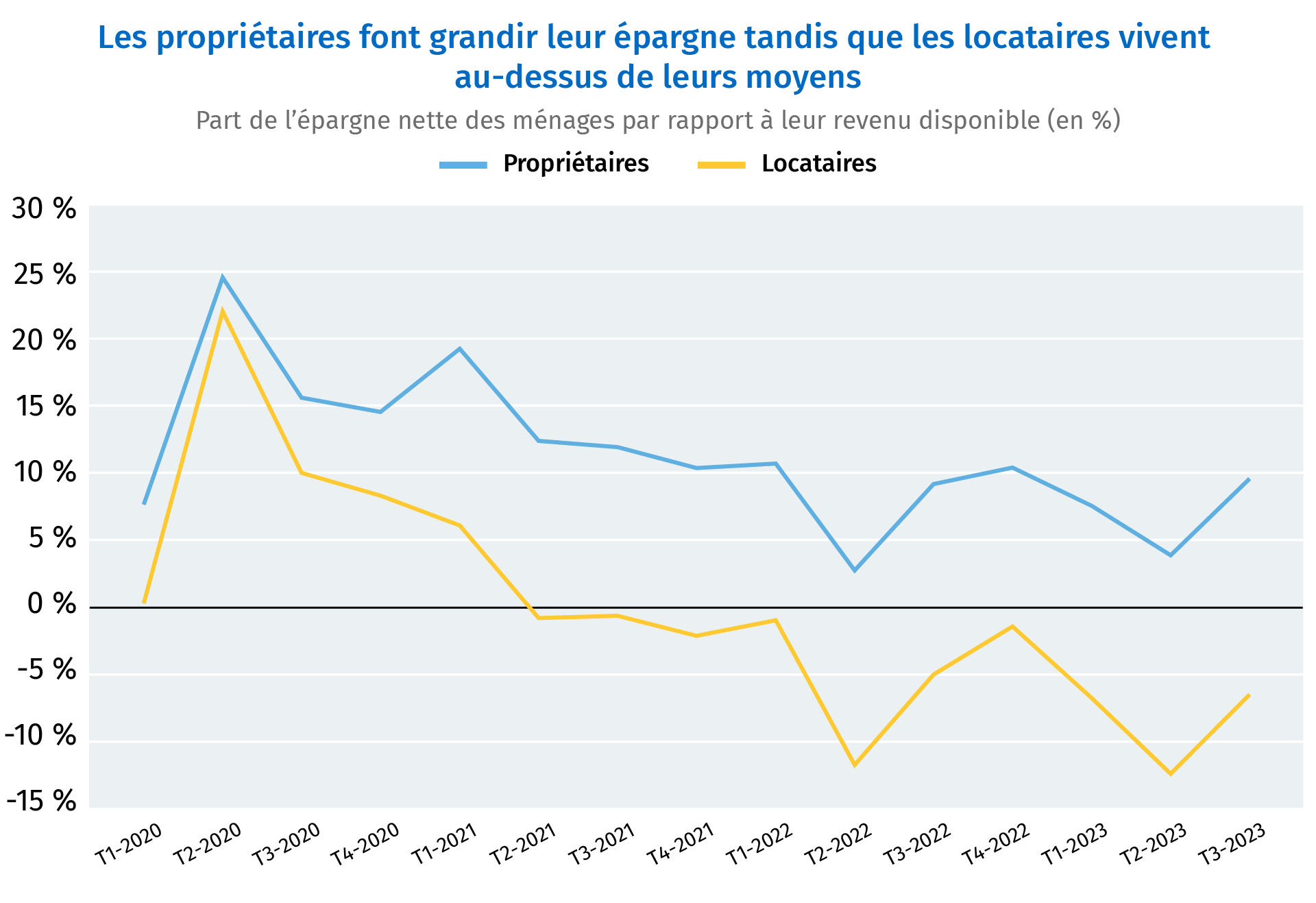 Le troisième trimestre de 2023 a toutefois marqué un tournant : tant les propriétaires que les locataires ont alors vu leur patrimoine net diminuer. Les locataires ont toutefois sans équivoque été plus durement touchés . En plus d’affronter un repli du patrimoine constitué pendant la pandémie (en grande partie dû à la moins-value des actifs financiers), les locataires au Canada se sont à nouveau mis à désépargner dans l’ensemble, c.-à-d. à dépenser plus qu’ils ne gagnaient chaque trimestre. Dans l’ensemble, les locataires ont dépensé près de 9 % de plus que le revenu disponible de leur ménage en 2023, alors que les propriétaires ont épargné 7 % de leur salaire net.