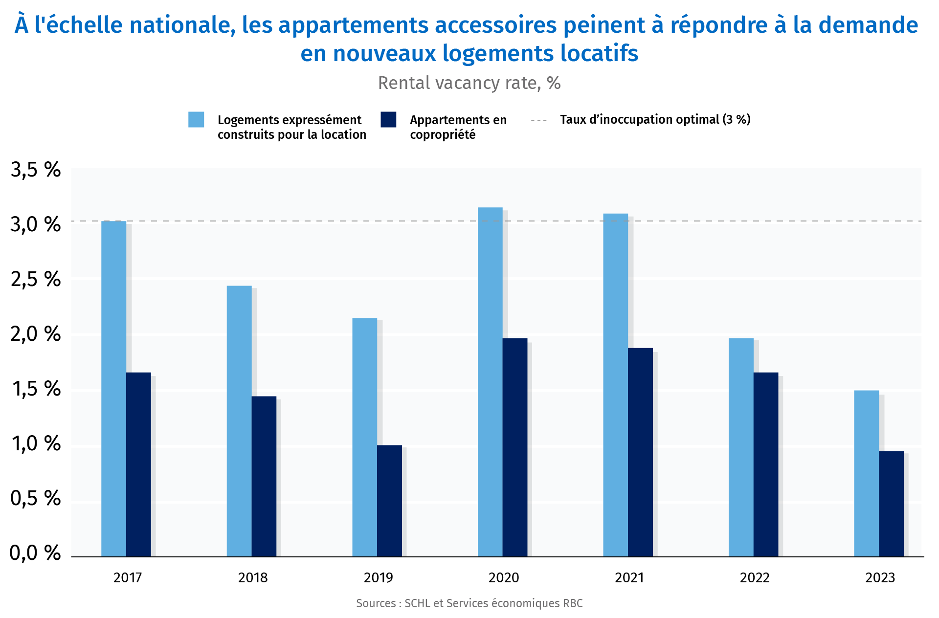 De 2017 à 2023, la demande de logements locatifs a cru plus de trois fois plus vite que le nombre de logements existants construits expressément pour la location. Les autres types d’unités locatives (appartements en copropriété ou accessoires) ont permis de combler en partie le déficit, mais eux aussi deviennent rares. Le taux d’inoccupation des condos est même inférieur à celui des appartements construits expressément pour la location – l’an dernier, la moyenne nationale a chuté à 0,9 %.