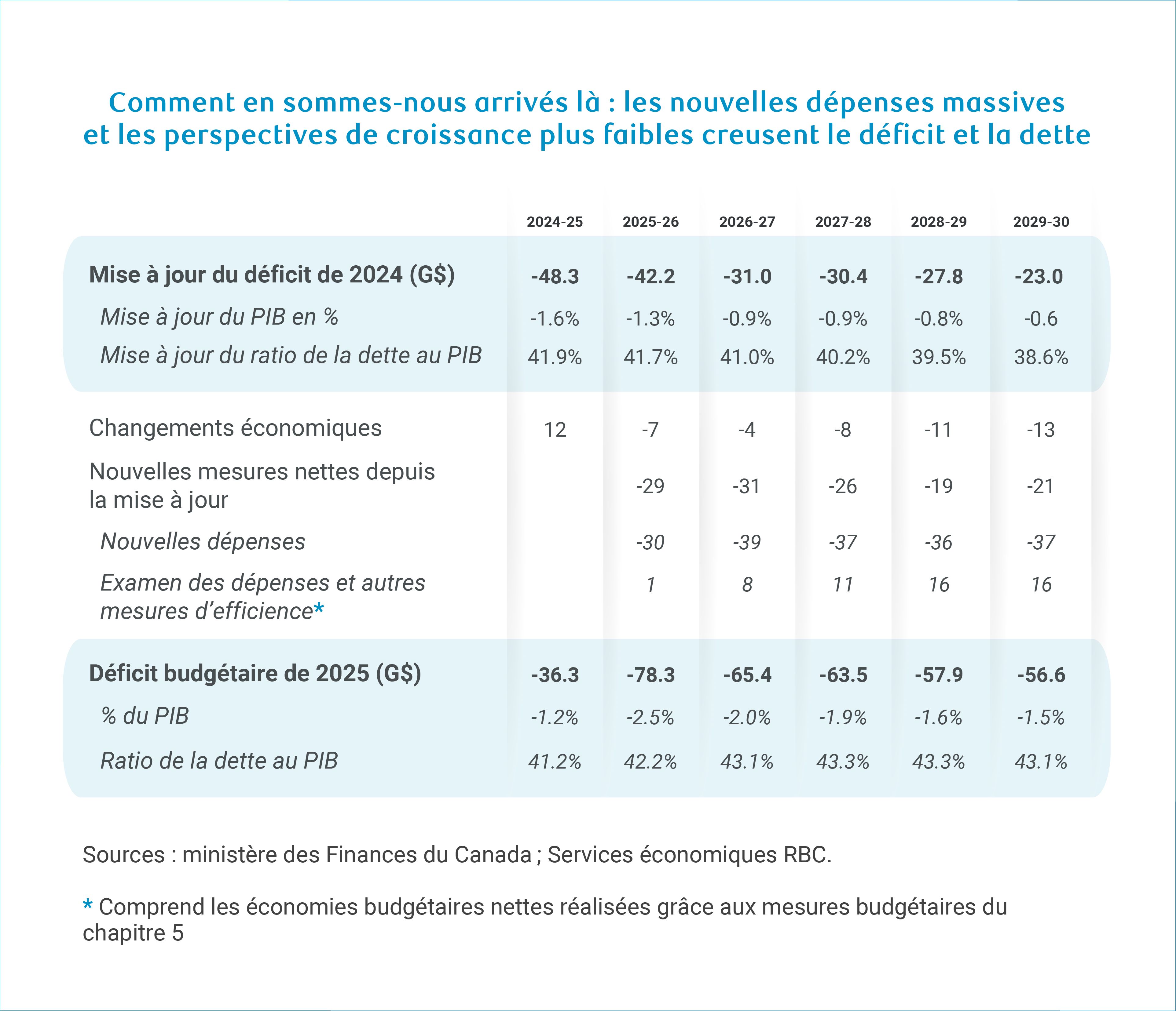 Le profil de croissance plus faible que prévu creuse de 42 milliards de dollars l’écart négatif par rapport à l’Énoncé économique de l’automne 2024 pour la période considérée, mais ce montant est éclipsé par de nouvelles dépenses nettes de 126 milliards de dollars.
