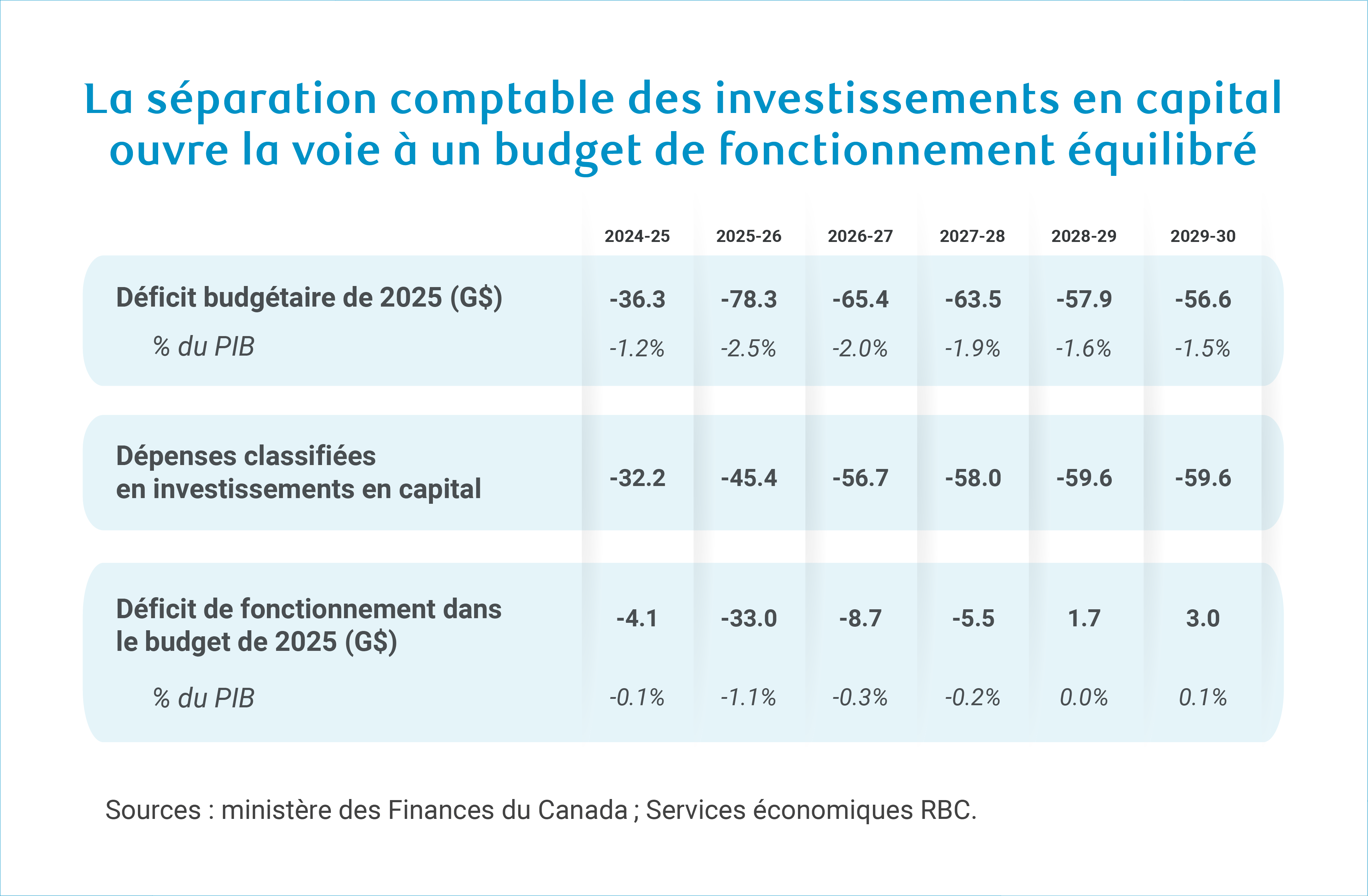 Les dépenses de fonctionnement reclassifiées en investissements en capital représentent de 1,4 % à 1,7 % du PIB à partir de 2025-2026. Le budget de fonctionnement s’améliorera ainsi à un solde de -0,3 % du PIB l’an prochain pour devenir positif à partir de l’exercice 2028-2029, conformément à l’autre cible budgétaire visant à équilibrer le budget de fonctionnement dans les trois prochaines années.