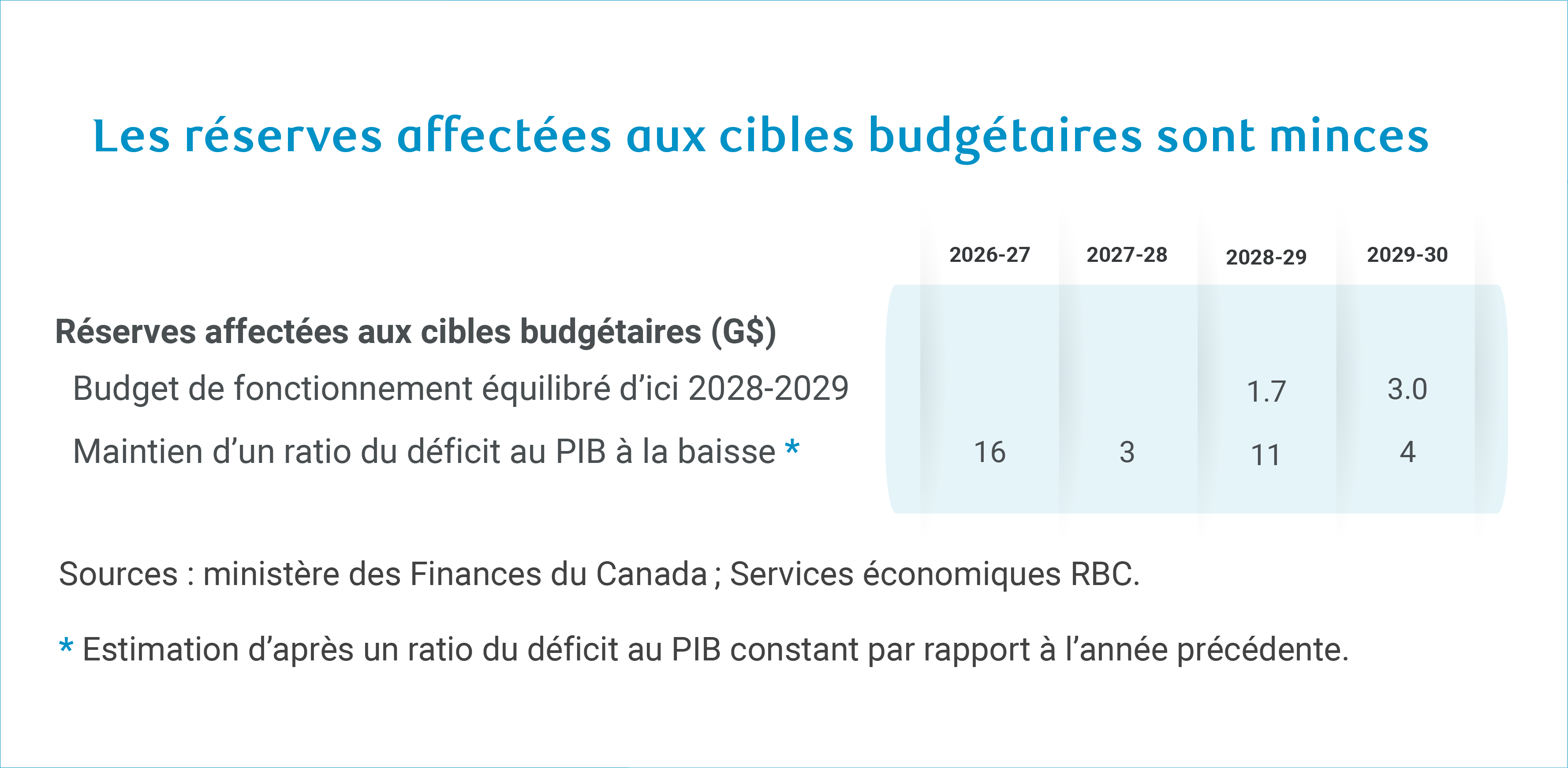 Le gouvernement dispose de réserves très faibles pour atteindre sa cible budgétaire d’équilibre du budget de fonctionnement, avec seulement 1,7 milliard de dollars alors qu’il lui manque 3 milliards de dollars pour parvenir à un solde positif dans les deux dernières années de la période de prévision en tenant compte de l’examen des dépenses et des économies attendues. Son scénario pessimiste modéré (voir ci-dessous) retrancherait du résultat net environ 9,2 milliards de dollars par an, dont la plus grande partie serait affectée au solde de fonctionnement. La baisse du ratio du déficit au PIB est un peu plus encourageante compte tenu de la réserve d’environ 16 milliards de dollars en 2026-2027.