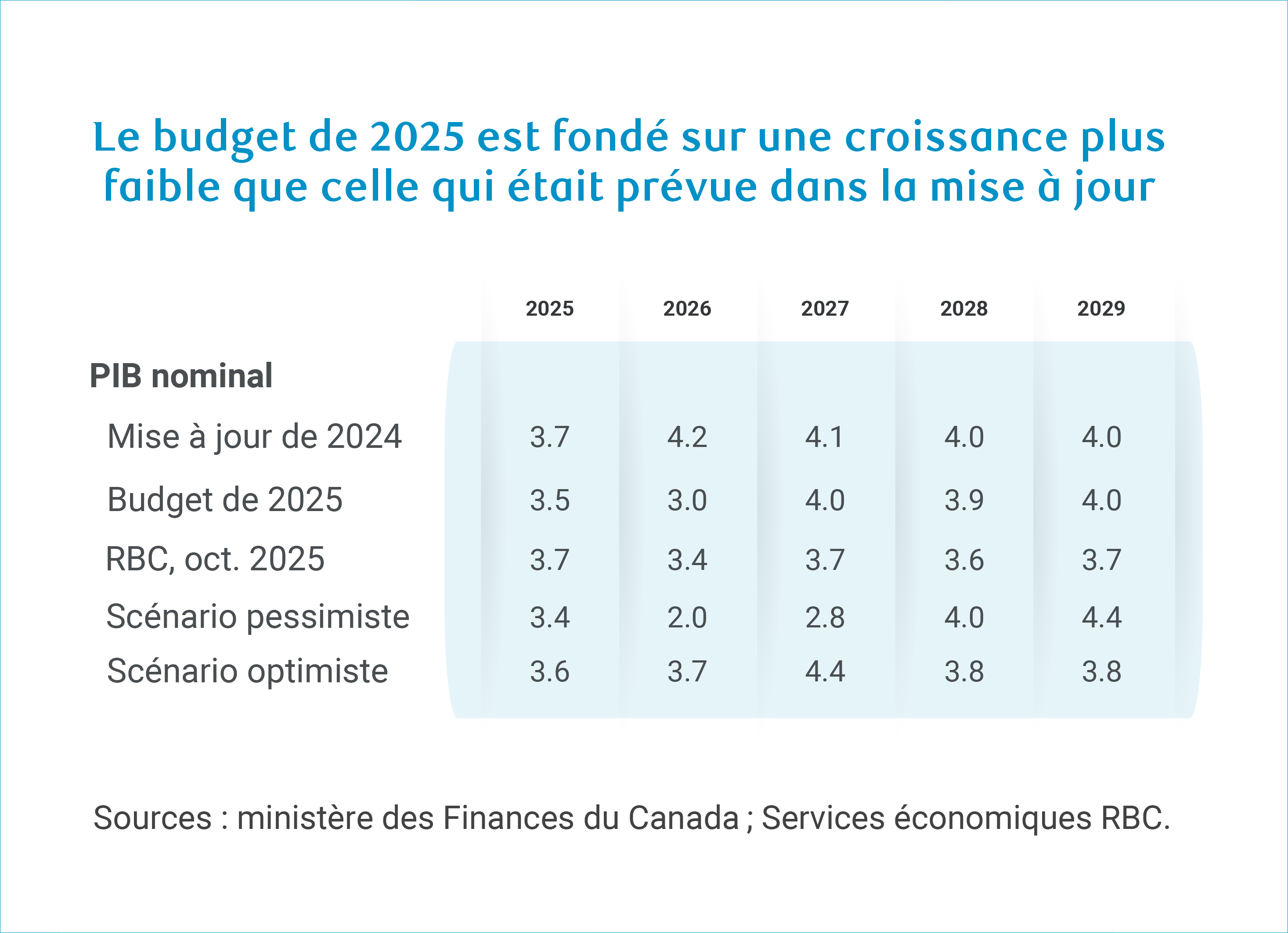 Le budget de 2025 prévoit une trajectoire du PIB nominal légèrement plus faible que dans l’Énoncé économique de l’automne 2024, en particulier en 2026. L’hypothèse de croissance retenue dans le budget est également légèrement plus faible que les dernières prévisions de RBC pour 2025 et 2026, mais elle est un peu plus élevée pour les dernières années.
