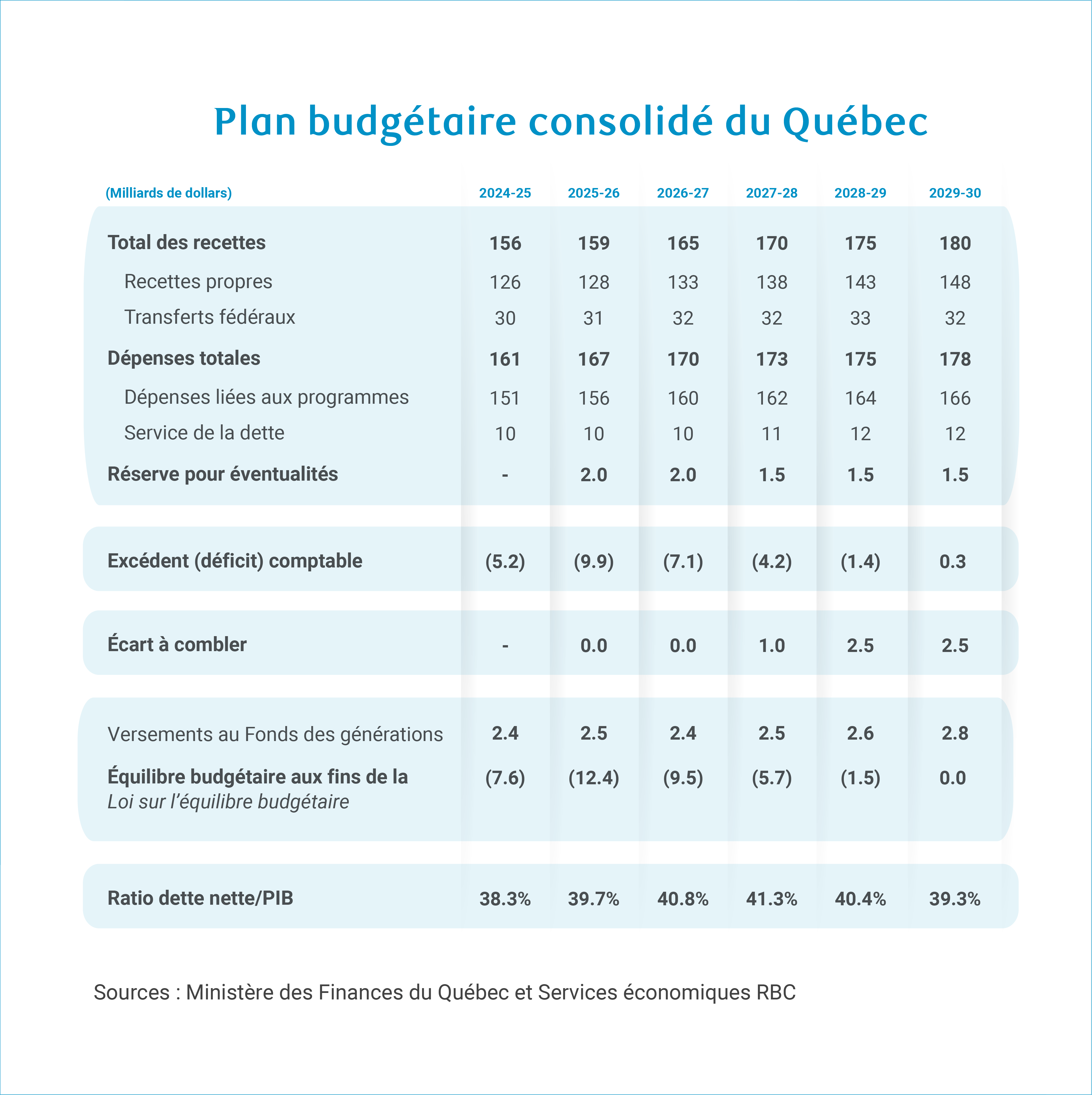 Le fardeau de la dette se détériore toutefois à moyen terme. Le ratio dette nette/PIB s’établit à 38,3 % en 2024-2025, soit près de son plus bas niveau en deux décennies, mais il devrait augmenter pour atteindre un sommet de plus de 41 % en 2027-2028, avant de baisser à nouveau pour s’établir à 39,3 % en 2029-2030.