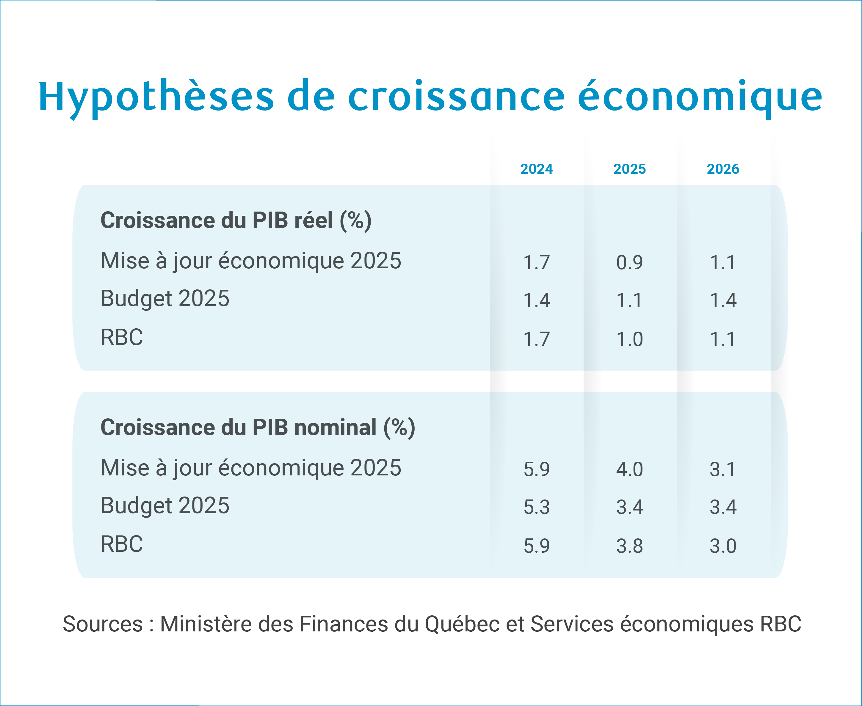 La croissance du PIB nominal du Québec a été révisée à la hausse en 2025, passant de 3,4 % à 4,0 %, ce qui témoigne d’un rendement plus élevé que prévu en 2024 et d’une dynamique des salaires résiliente à ce jour.