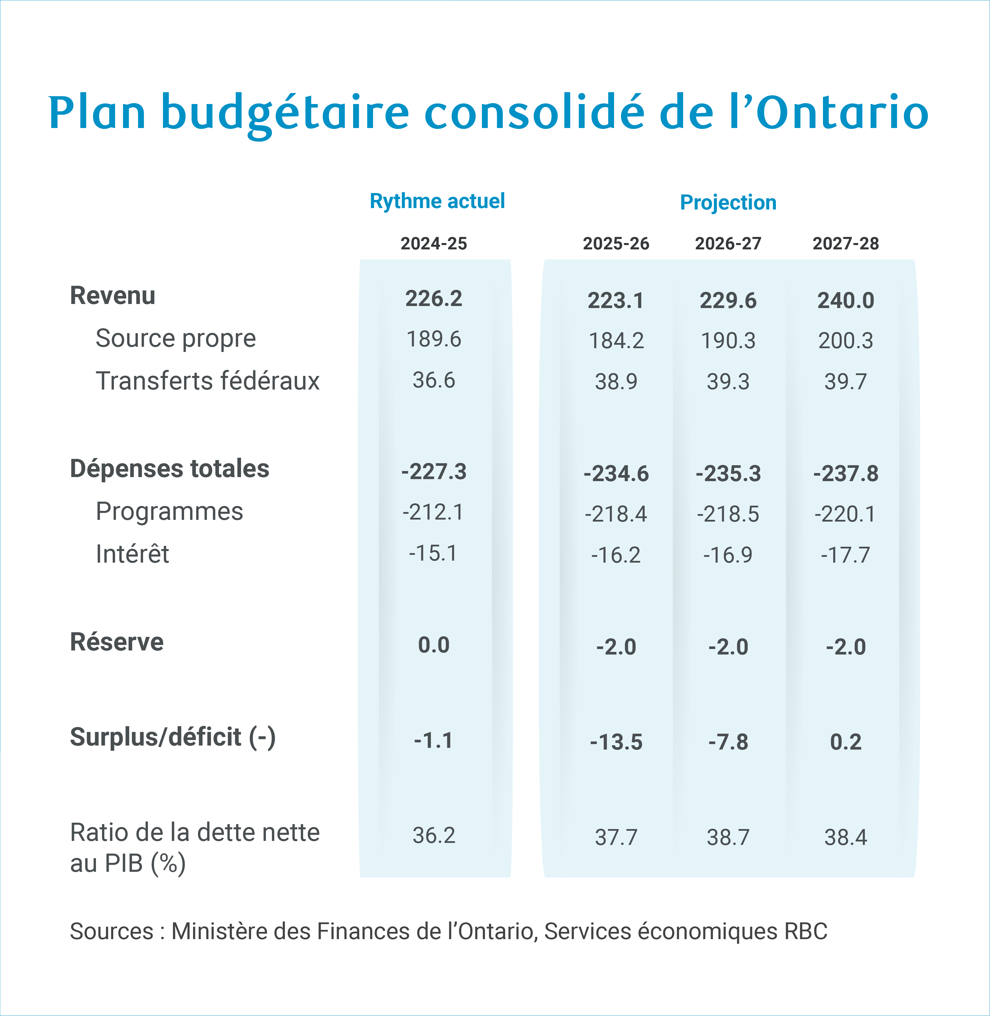 Étant donné que les charges d’intérêts et la réserve ont peu changé, la projection de déficit s’est améliorée de 1,1 milliard de dollars pour 2025-2026 et reste stable par la suite.