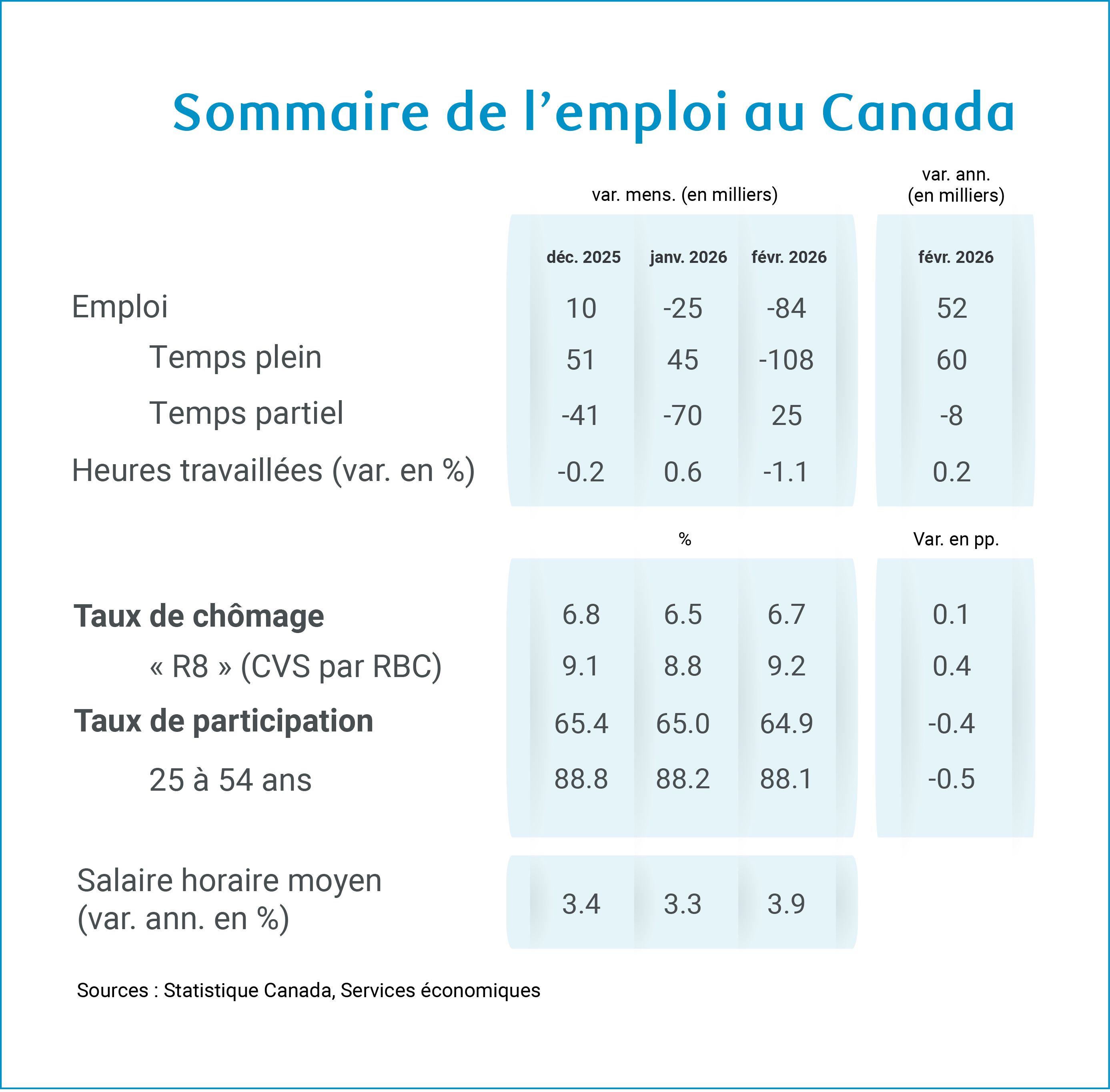 Le rapport sur le marché du travail canadien de février s’est révélé décevant. L’emploi a reculé de 84 000 postes, venant s’ajouter aux 25 000 suppressions d’emplois enregistrées en janvier. Le taux de chômage est remonté à 6,7 % après être tombé à 6,5 % en janvier, et le taux d’activité a de nouveau baissé, atteignant son plus bas niveau hors période de pandémie depuis 1997.