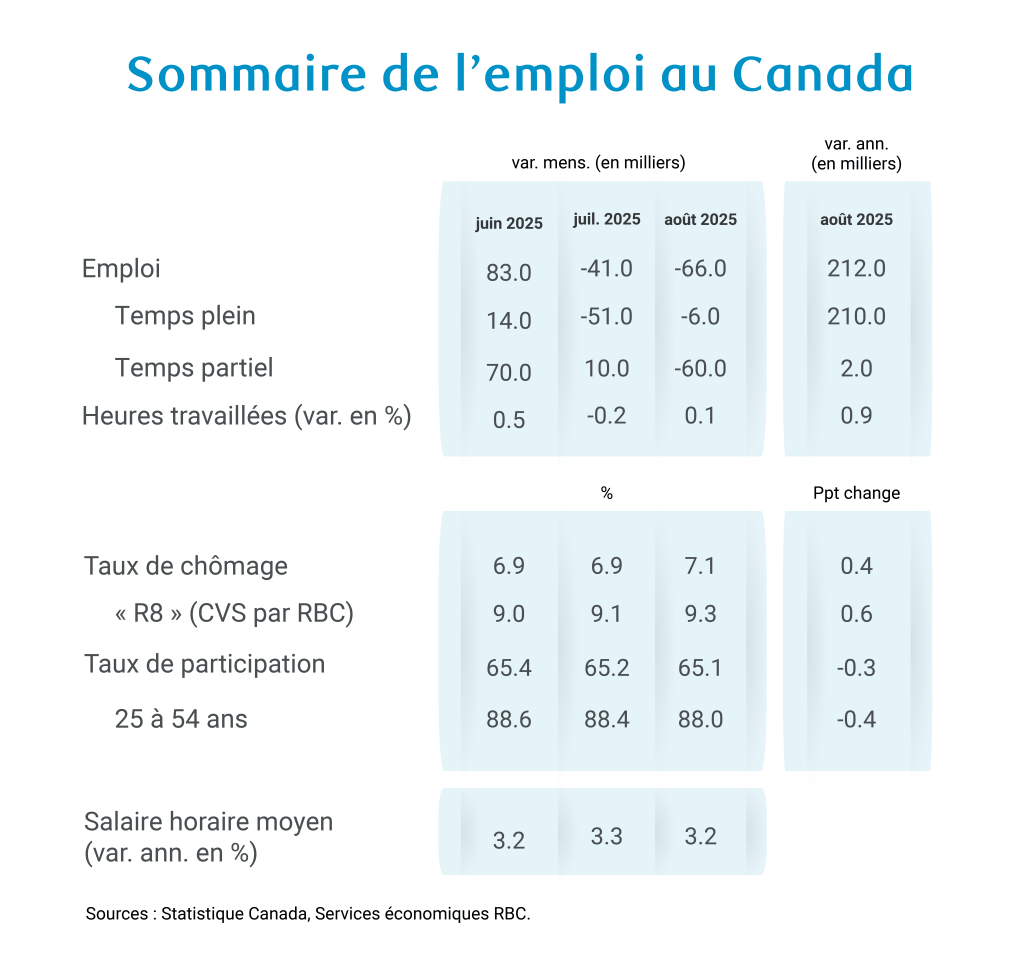 Le Canada a perdu 66 000 emplois en août, après en avoir cédé 41 000 en juillet. C’est là une preuve supplémentaire que le marché du travail canadien souffre de la guerre commerciale. Cette aggravation de la tendance durant l’été reflète les conditions au sud de la frontière : aux États-Unis, la croissance de l’emploi est généralement tombée en point mort en mai, et le taux de chômage a augmenté.