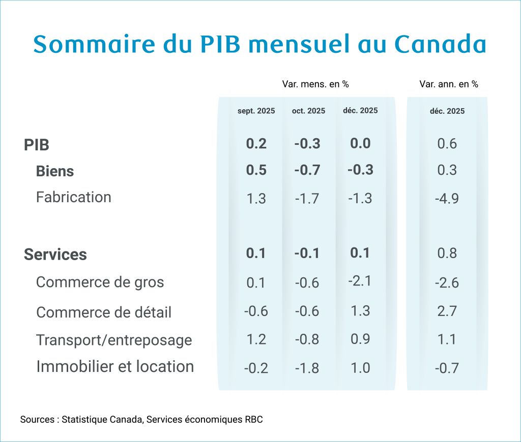 Les estimations préliminaires de Statistique Canada pour décembre indiquent une croissance du PIB de 0,1 %, alimentée principalement par les gains enregistrés dans les secteurs manufacturier et du commerce de gros, qui ont été partiellement atténués par les baisses observées dans les segments des mines, des carrières et de l’extraction pétrolière et gazière.