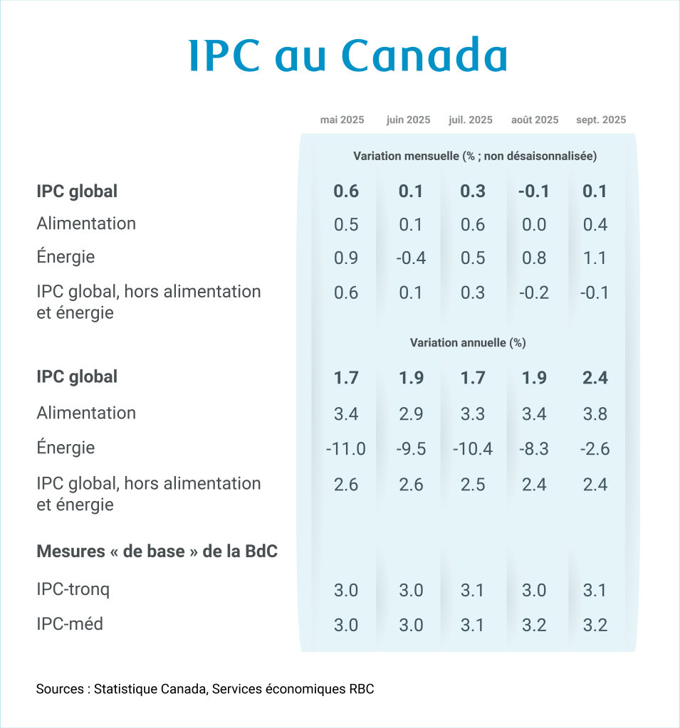 L’inflation globale a grimpé en septembre pour s’établir à 2,4 % d’une année sur l’autre, contre 1,9 % en août, alors que nous nous attendions à un taux de 2,3 %. Cette accélération est principalement attribuable à un recul des prix de l’énergie moins important que lors des mois précédents, sur une base annuelle. Cependant, les mesures de base privilégiées par la Banque du Canada sont restées robustes. L’IPC-tronq aussi bien que l’IPC-méd se situent légèrement au-dessus de 3 % sur 12 mois, avec une légère accélération selon leur moyenne mobile sur trois mois.