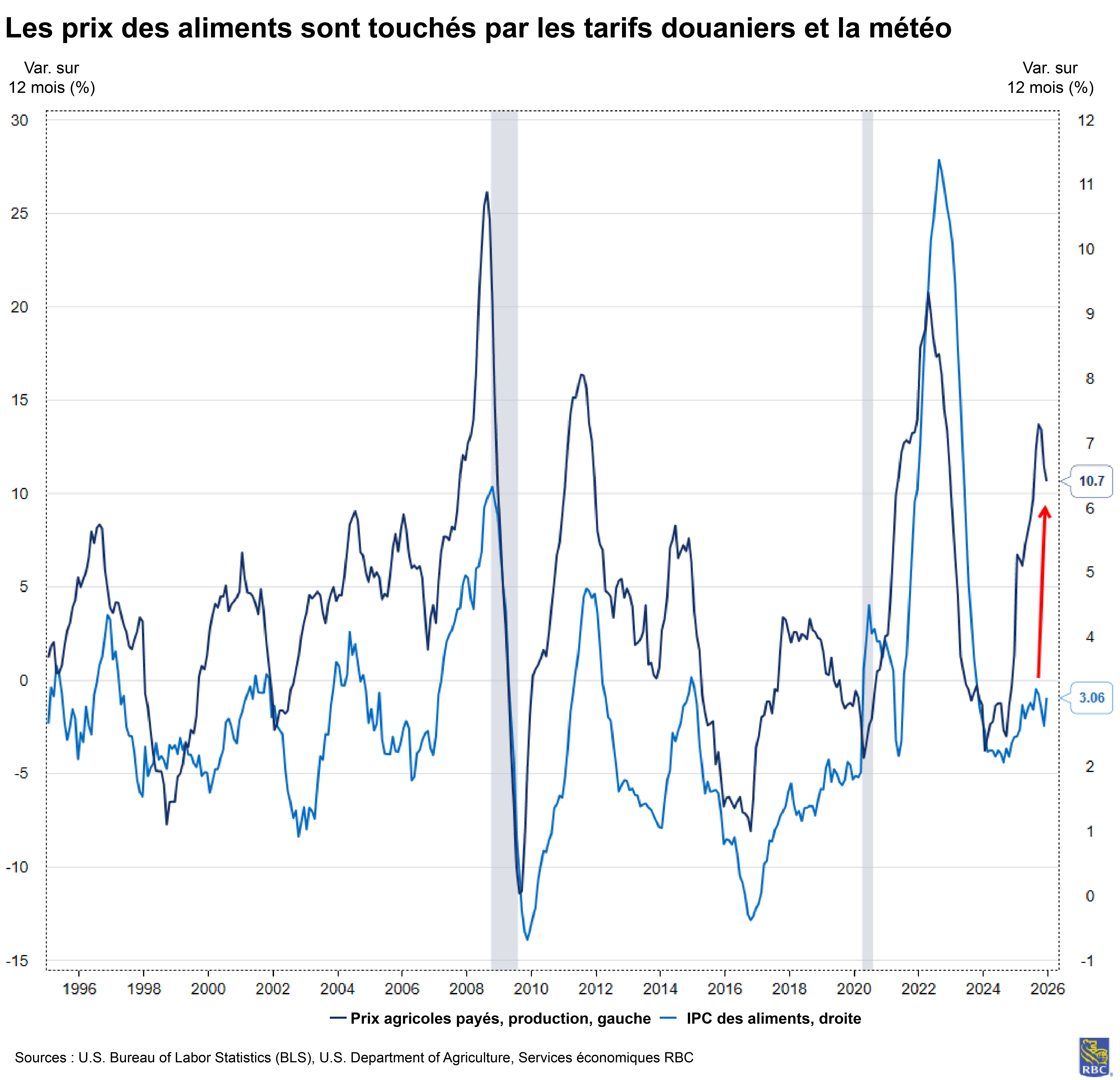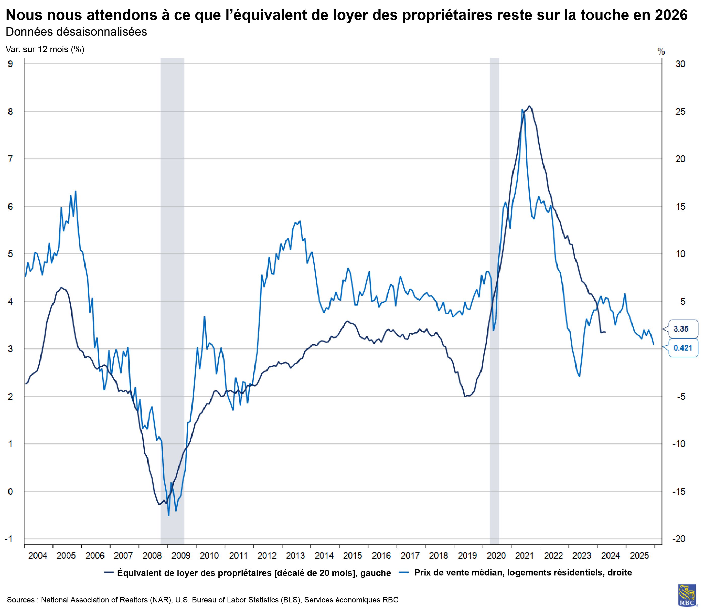 À l’approche de la barre des cinq ans d’inflation supérieure à la cible de 2 % de la Federal Reserve, nous demeurons préoccupés par la probabilité qu’elle demeure près de 3 % tout au long de 2026. La combinaison du resserrement du marché de l’emploi, de la vigueur des dépenses de consommation, de la répercussion des droits de douane et d’une mesure de l’inflation du marché de l’habitation à la traîne est une recette pour une inflation persistante.