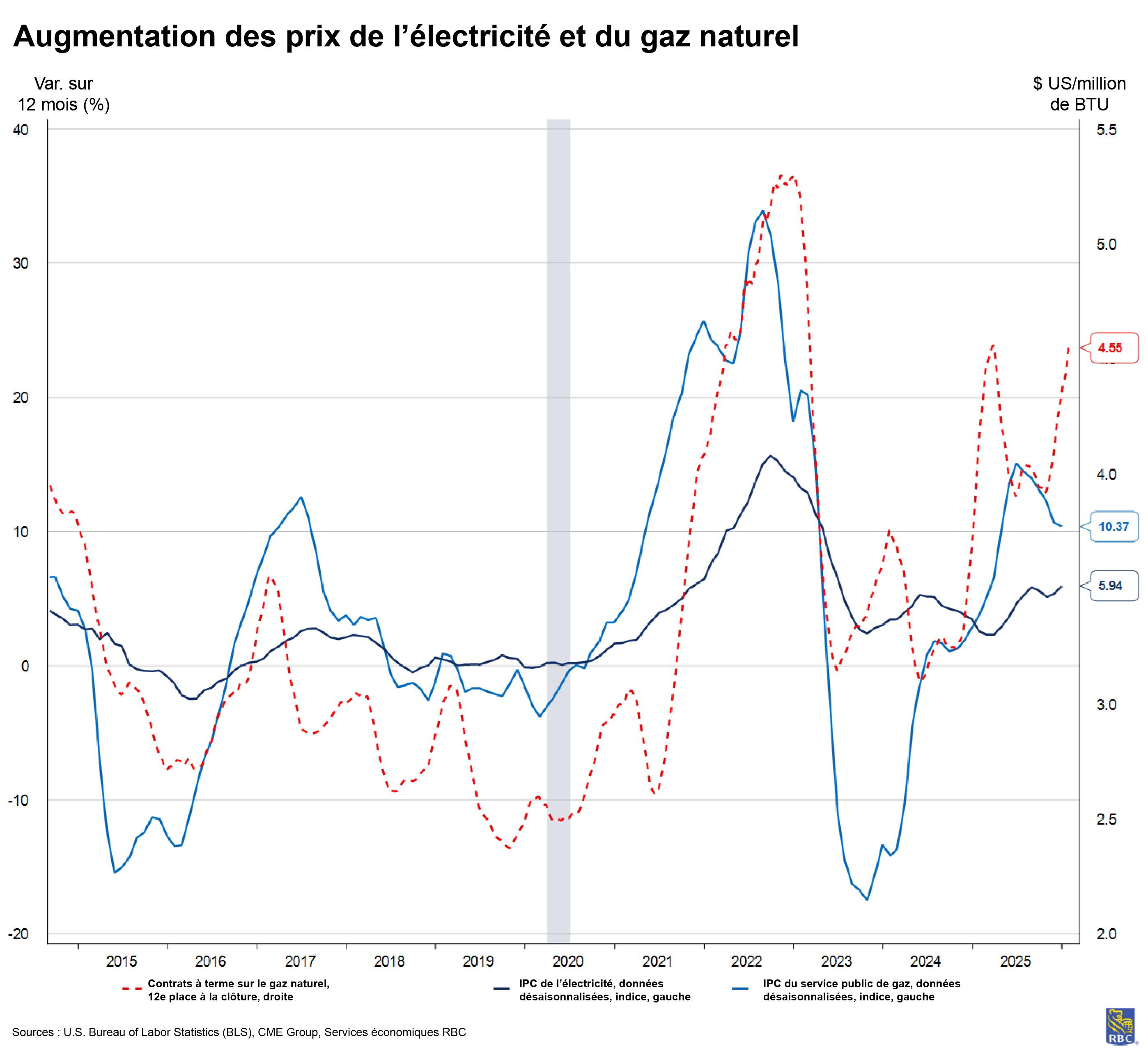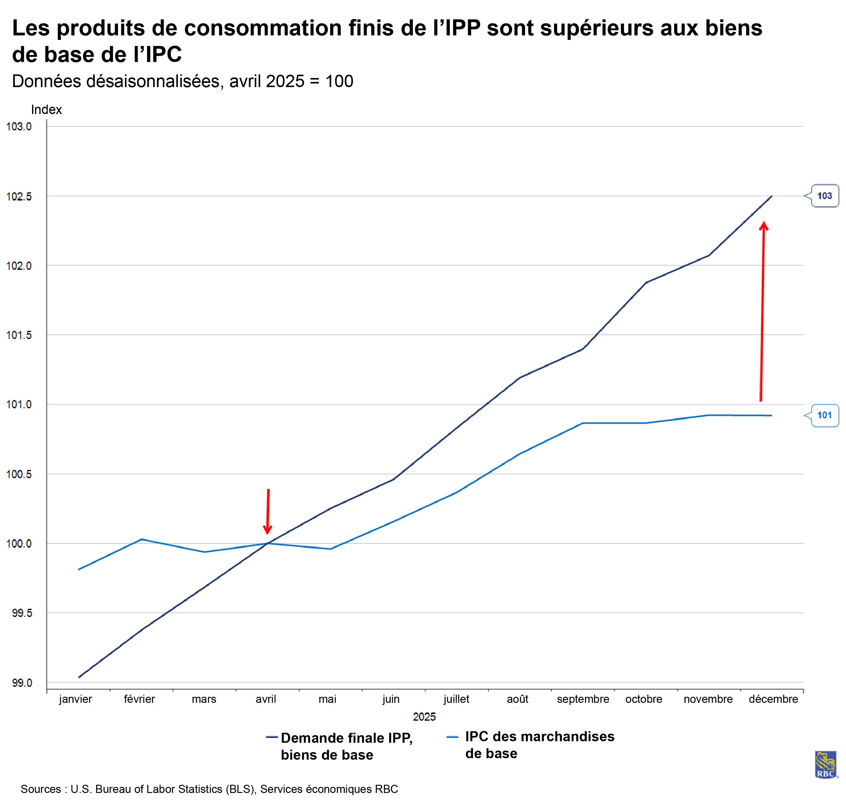 Avec l’ajout de droits de douane, nous estimons que la contribution des biens de base à l’IPC de base a ajouté 0,3 point de pourcentage sur un an au troisième trimestre, ce qui est nettement supérieur à la norme d’avant la COVID-19. Nous demeurons préoccupés par le fait que nous n’avons pas encore constaté la répercussion intégrale des droits de douane sur les prix des biens de consommation, qui devraient, selon nous, atteindre leur sommet au deuxième trimestre de 2026.