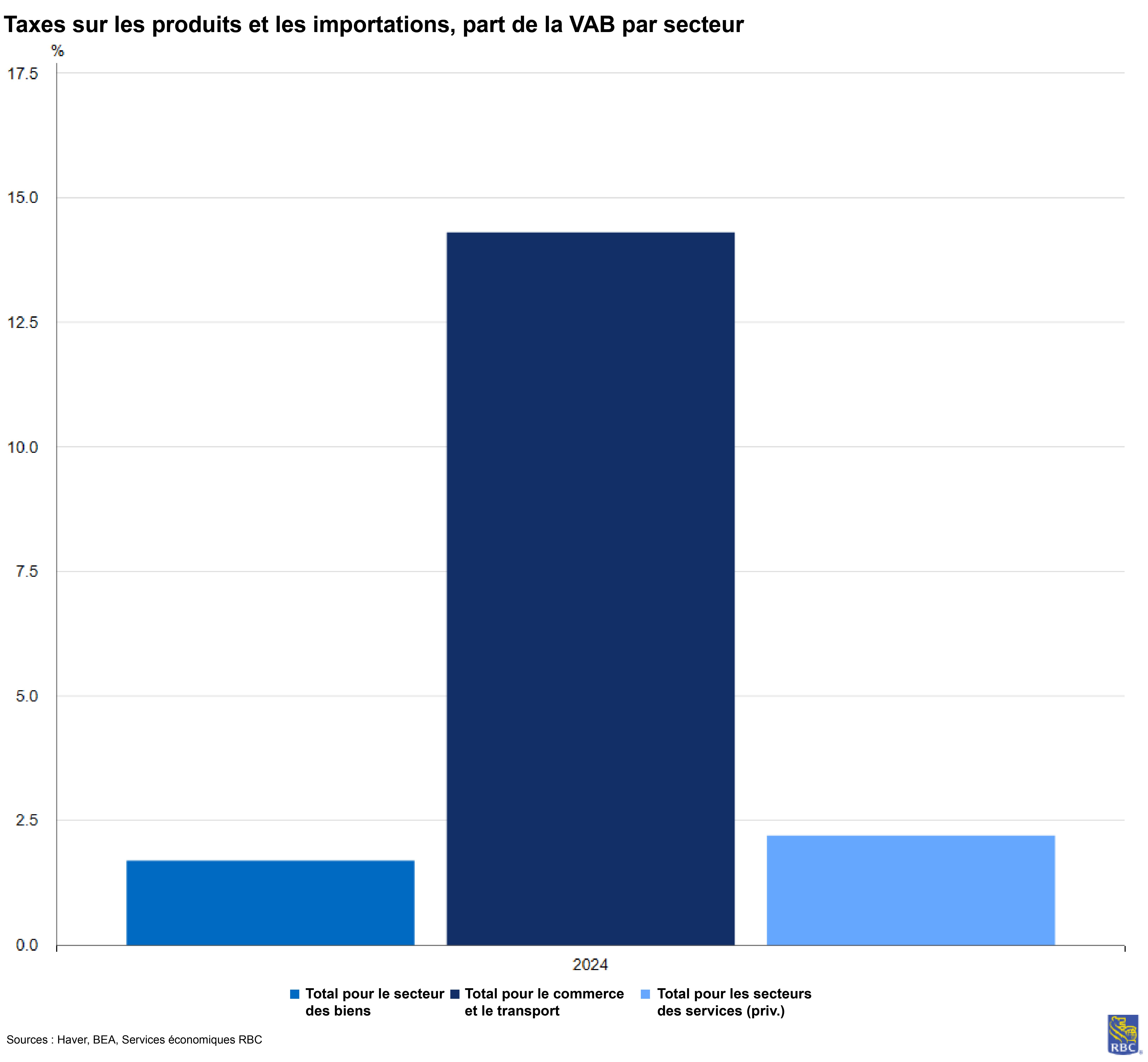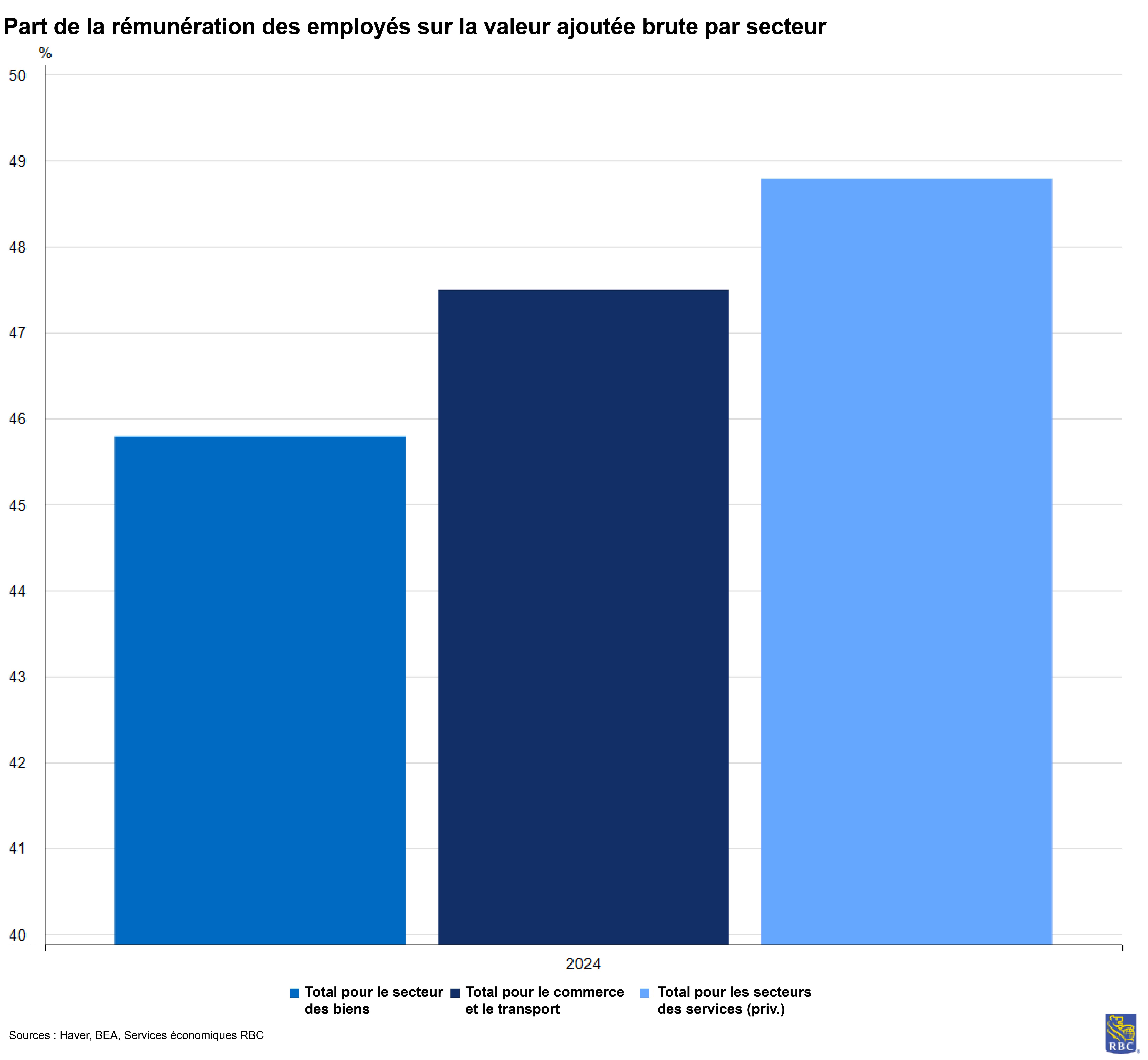 Fait important, l’inflation des services peut être largement attribuée au resserrement du marché de l’emploi. En pourcentage de la valeur ajoutée brute, soit la contribution du secteur au PIB, la rémunération des employés représente 49 % des coûts des intrants, comparativement à 46 % pour le secteur des biens. Toutefois, le secteur du commerce, du transport et de l’entreposage est particulièrement vulnérable aux pressions tarifaires en raison de faibles marges. Son exposition est près de sept fois supérieure à celle du secteur des biens et services. Nous craignons que le rapport sur l’IPP de décembre ne soit pas le dernier où nous verrons les marges du secteur subir des pressions.