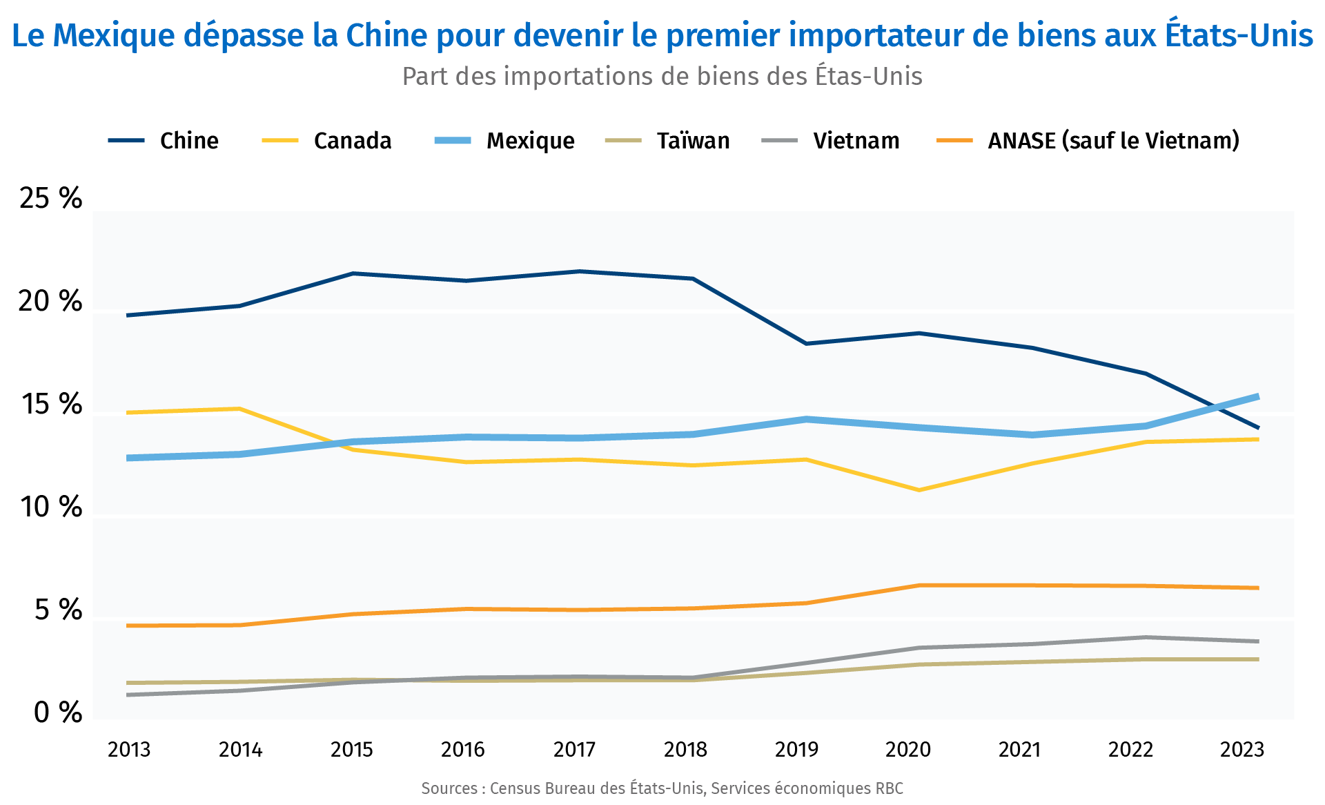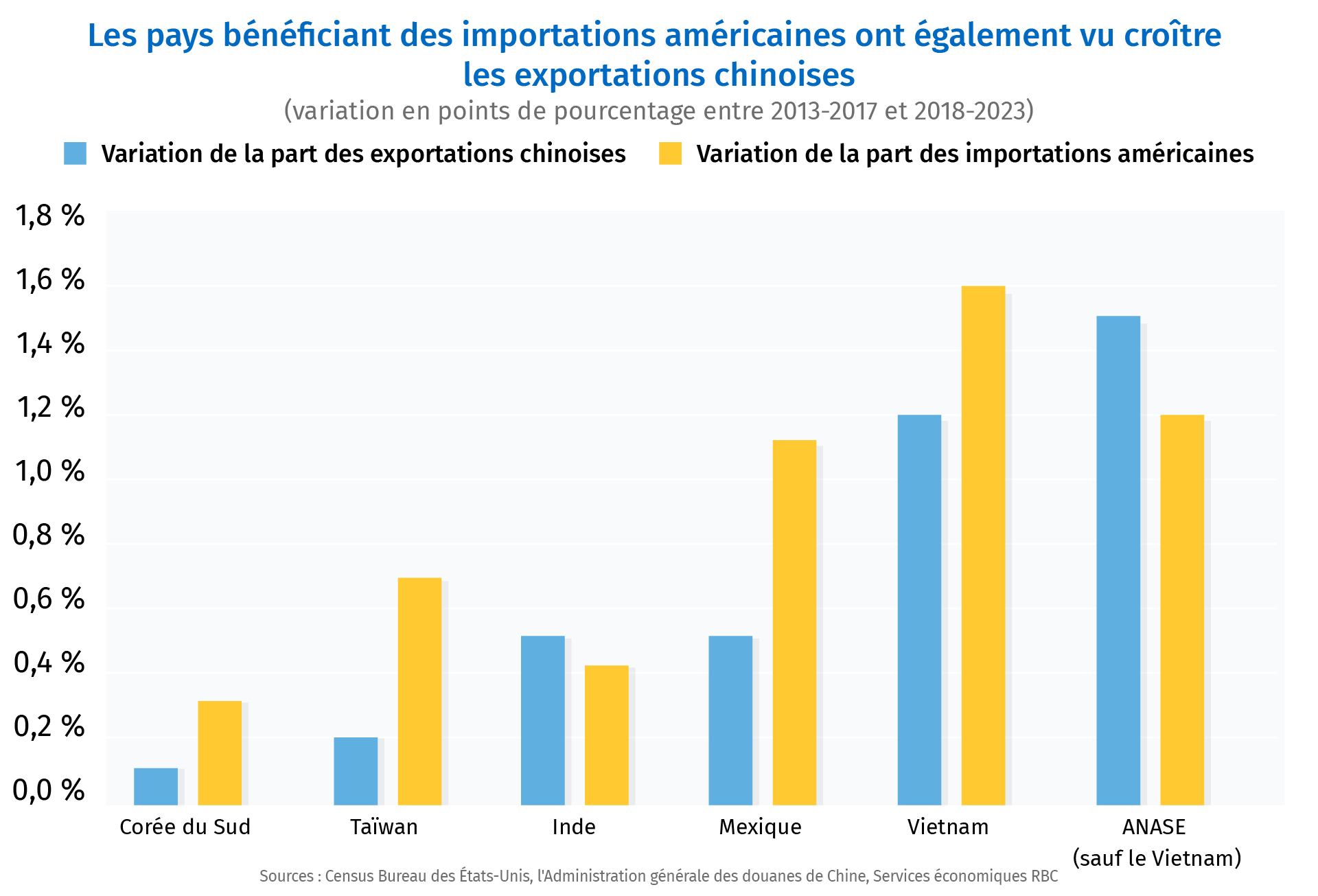 Ce changement met en évidence une reconfiguration des chaînes logistiques mondiales, puisque les sociétés ont en grande partie cherché à atténuer les conséquences des droits de douane. Le Mexique représente désormais la plus grande part des importations de biens aux États-Unis (15,4 %), tandis que certaines régions voient leur part augmenter de plus de 1 % depuis 2017, notamment le Vietnam et la région de l’Association des nations de l’Asie du Sud-Est (ANASE) (sauf le Vietnam).