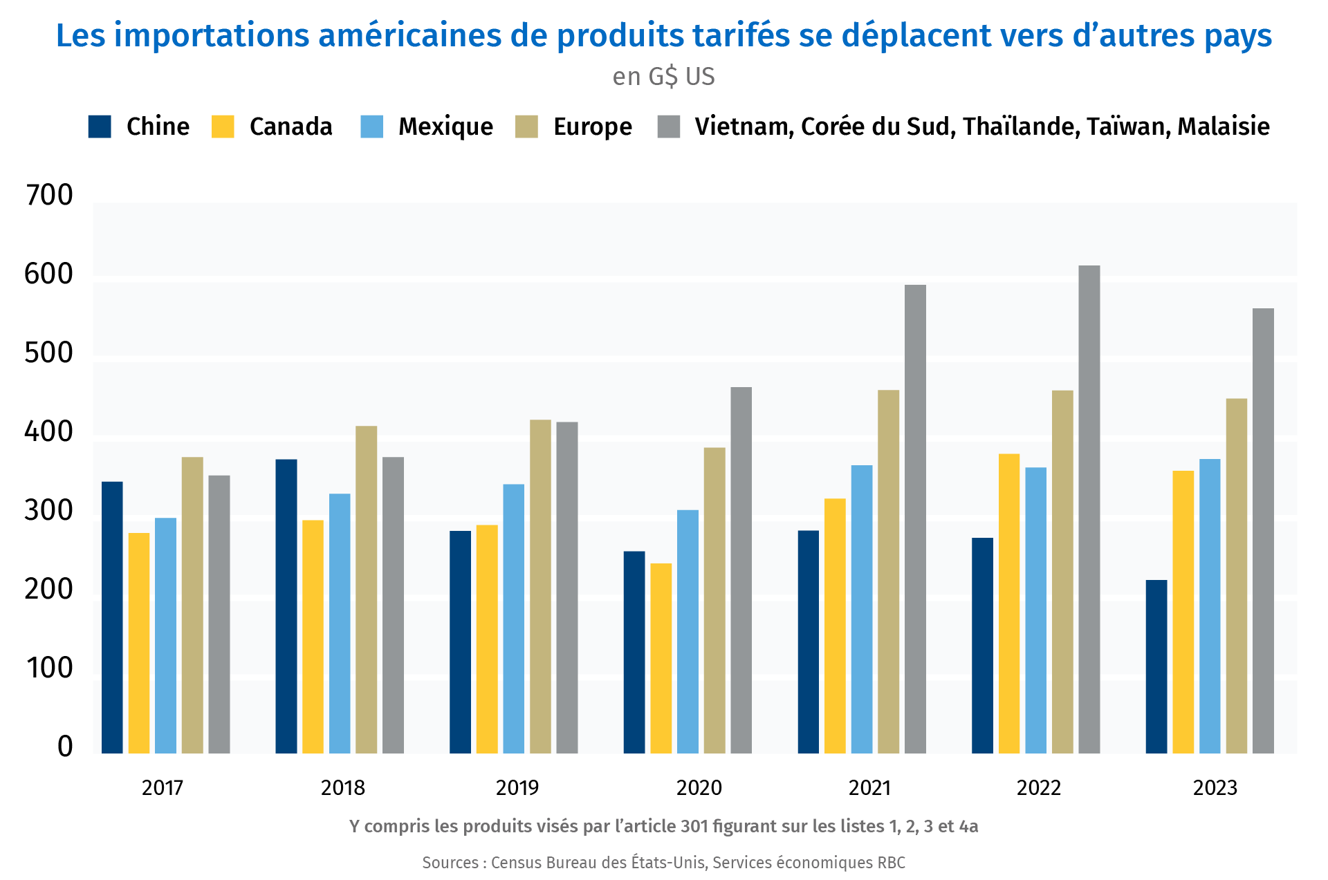 Depuis 2017, les États-Unis importent davantage de biens en provenance du Mexique, du Canada et de pays asiatiques tels que le Vietnam et Taïwan.