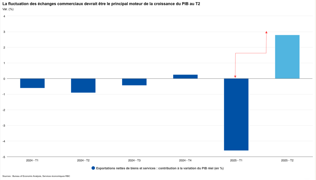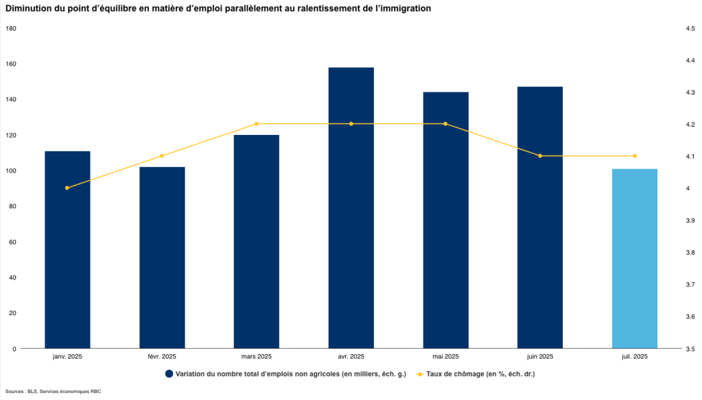 La réunion du Comité fédéral de l’open market qui aura lieu la semaine prochaine (le 30 juillet) risque d’être complètement éclipsée par la publication de toute une série de données économiques. Le rapport sur le PIB et le rapport sur l’emploi au deuxième trimestre seront les principaux points d’intérêt, mais ni l’un ni l’autre ne devrait influer sur les perspectives économiques de la Fed. Nous prévoyons un rebond de la croissance du PIB à 2,5 % au T2, l’envolée des importations s’étant atténuée et les consommateurs maintenant des dépenses réelles positives. Dans le même ordre d’idées, nous croyons que le marché du travail demeurera tendu, que le taux de chômage se maintiendra à 4,1 % et que 101 000 emplois seront créés en juillet. Ce chiffre représente certes un ralentissement par rapport aux gains enregistrés plus tôt cette année, mais il survient en même temps qu’un ralentissement de l’immigration, ce qui signifie que le taux du seuil de rentabilité (c.-à-d. les gains d’emploi requis pour maintenir un taux de chômage stable) diminue. En outre, nous prévoyons que les demandes initiales de prestations d’assurance-emploi demeureront à des niveaux peu élevés après avoir affiché une baisse inattendue cette semaine, ce qui témoigne du nombre de licenciements toujours bas.