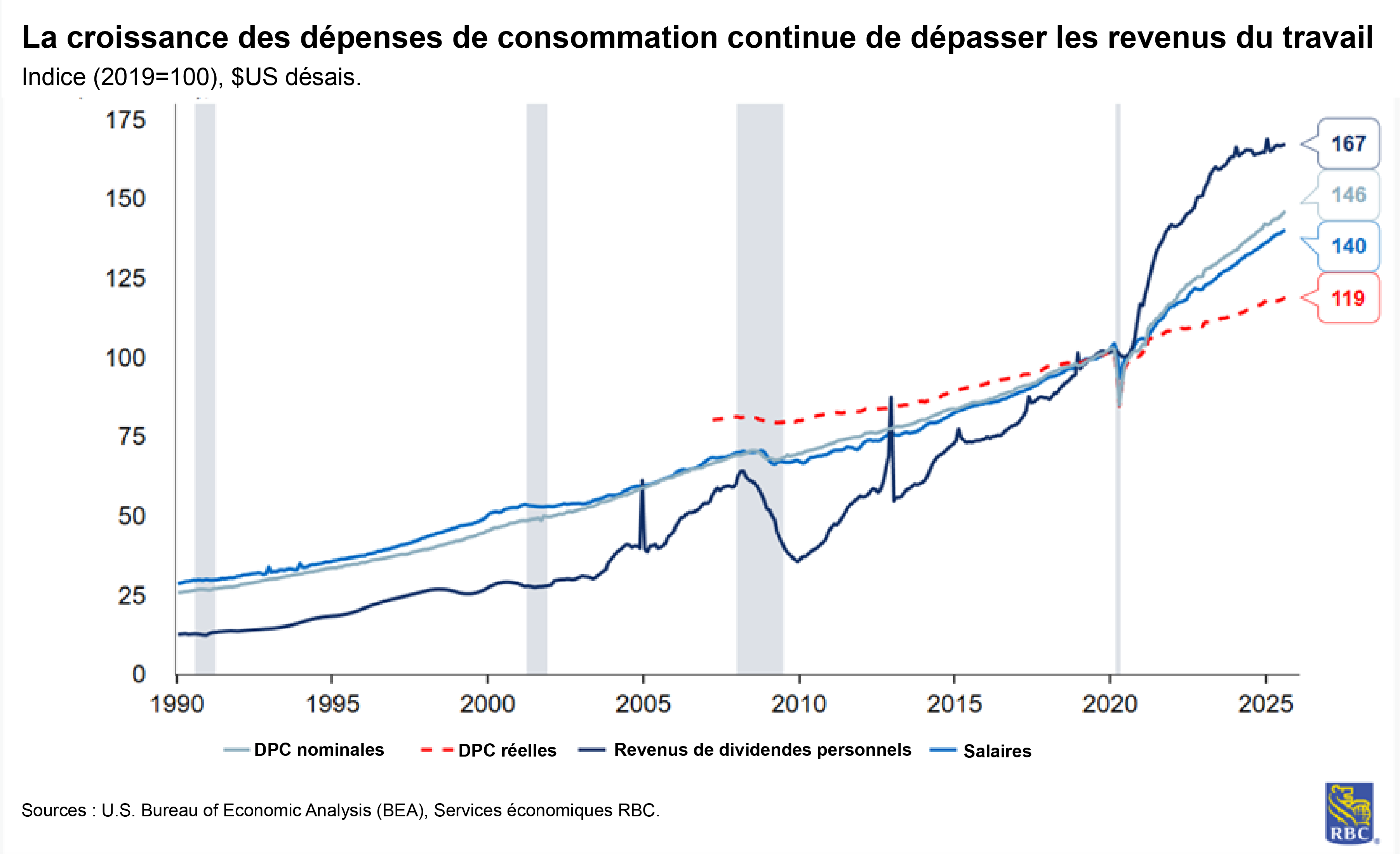 La dynamique de consommation est également importante pour les deux volets du mandat de la Fed. Aussi, nous nous attendons à voir une croissance modérée des dépenses personnelles en septembre (+0,1 % sur un mois) après que le rapport sur les ventes au détail de cette semaine ait indiqué que les consommateurs américains ont manqué de vigueur en septembre, après des mois de dépenses anticipées. La baisse considérable des ventes au détail (qui exclut les ventes d’automobiles et les dépenses en matériaux de construction, en essence et dans les restaurants) a été la première depuis avril. Le repli des ventes de véhicules à moteur laisse entendre que les dépenses pour des biens durables et non durables devraient ralentir par rapport à août. Les services continueront probablement de résister, car les ménages à revenu élevé continueront de dépenser, si l’on se fie aux dépenses de septembre pour les services de restauration et les débits de boissons. On s’attend à ce que le revenu personnel continue de croître à un rythme sain (+0,3 % sur un mois en septembre), mais le revenu non professionnel (plus précisément, les recettes des transferts personnels courants, c.‑à‑d. la sécurité sociale, l’assurance-maladie, et les revenus de dividendes) dépassera, dans de nombreux cas, la croissance des salaires.