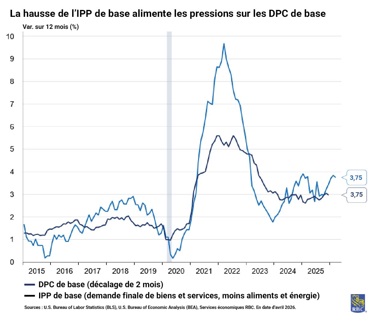 À ce jour, les prix globaux ont considérablement augmenté en raison des flambées des prix de l’essence découlant du conflit au Moyen-Orient. Même si la Fed est plus préoccupée par l’inflation de base que par l’inflation globale, les attentes à l’égard de l’inflation suivent de près les prix de l’essence, ce qui pourrait être problématique pour la Fed. En ce qui concerne l’inflation de base, les DPC de base, qui constituent la mesure de l’inflation privilégiée par la Fed, se situent toujours à 3,0 % sur 12 mois, et nous prévoyons qu’elles continueront de s’accélérer en mars (nos prévisions laissent entrevoir une hausse de la mesure des DPC de base sur 12 mois à 3,2 %). Pour mars, nous nous attendons à ce que les DPC de base augmentent de 0,3 % sur un mois. Même si l’IPC de base et l’IPP ont été inférieurs aux attentes en mars, nous ne nous attendons pas à un tel relâchement des DPC de base, car les segments qui comptent relativement plus pour les DPC (comme les services aux patients externes et les services hospitaliers et en centres d’hébergement et de soins de longue durée de l’IPP dans le secteur des soins de santé) ont fait bonne figure en mars. La hausse des prix du carburéacteur a également fait grimper les prix des billets d’avion, ce qui a fait grimper l’IPP des transports publics, un sous-ensemble de l’IPP qui est également important pour les DPC.