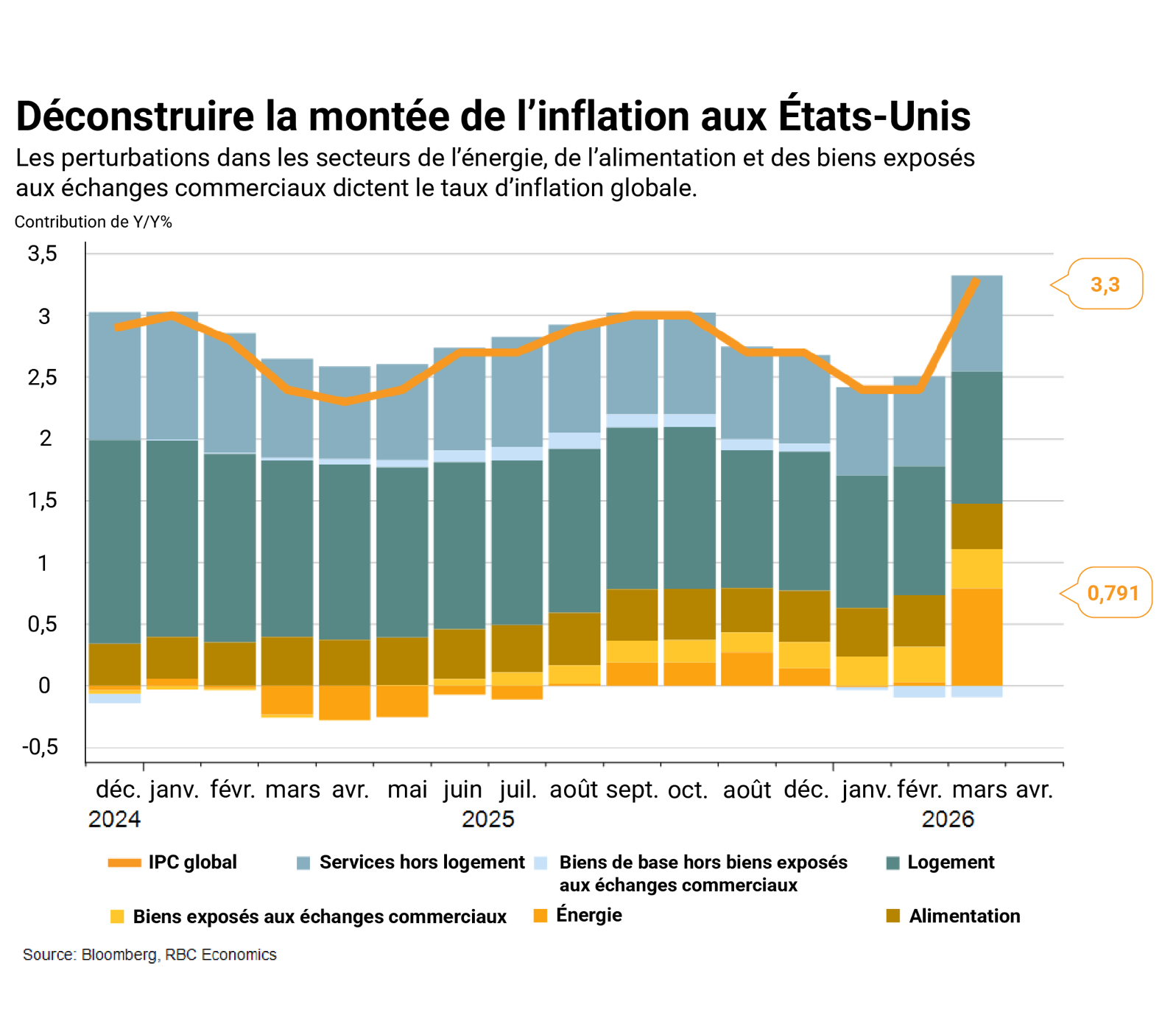La hausse des prix de l’essence a fait bondir l’inflation globale en mars, l’augmentation mensuelle (+0,9 % sur un mois) rappelant celle des années 1970. Un élément positif est que l’inflation de base est demeurée basse, n’ayant monté que légèrement, de +0,2 % sur un mois. Le ralentissement continu de l’inflation de base procurera un certain répit à la Fed. Il n’en demeure pas moins que la hausse des prix de l’énergie pourrait commencer à se répercuter sur l’ensemble de l’économie si le conflit au Moyen-Orient persiste. Les risques accrus liés au pétrole font grimper les coûts de transport et les effets persistants des droits de douane exercent des pressions supplémentaires sur les biens de base. Comme nous l’avons souligné, les prix dans les secteurs exposés aux échanges commerciaux, dont les pièces automobiles, les vêtements et les biens personnels et de loisirs ont continué d’augmenter à un rythme inconfortable. Pour la Fed, la question demeure de savoir comment les entreprises réagiront au choc des prix du pétrole : continueront-elles de répercuter la hausse des prix sur les consommateurs ou protégeront-elles la compression des marges au moyen de mises à pied? Pour l’instant, la Fed devra continuer de s’en remettre aux données avant de prendre sa prochaine décision.